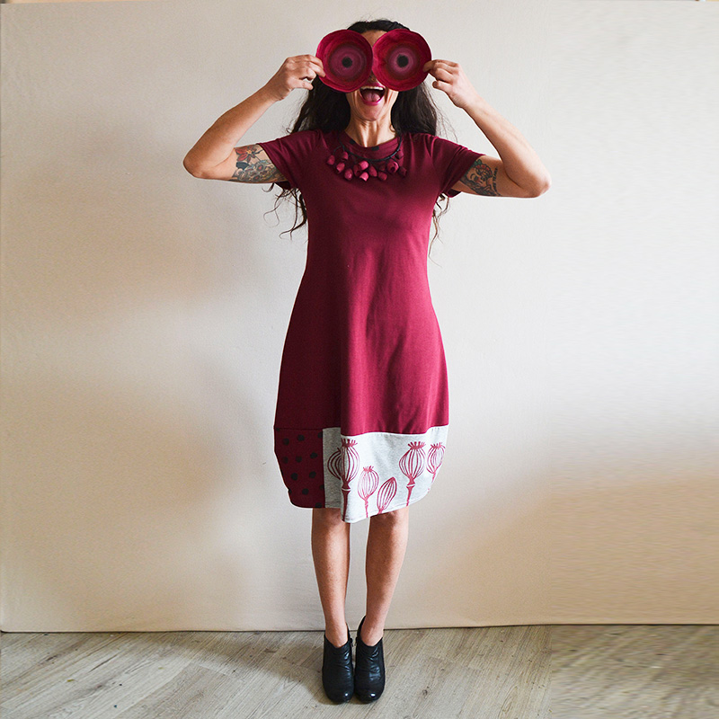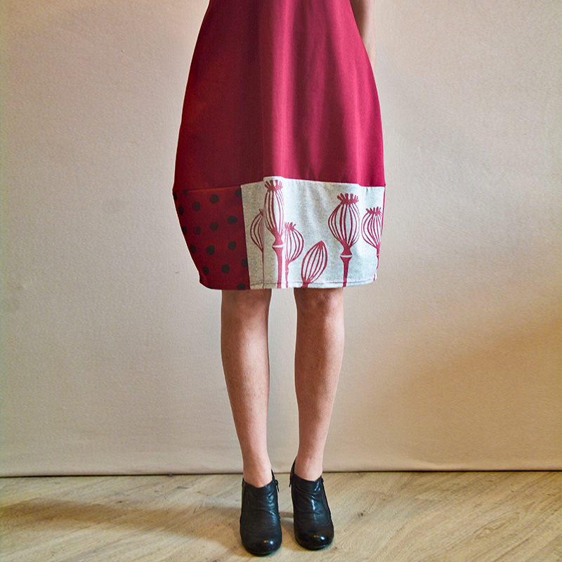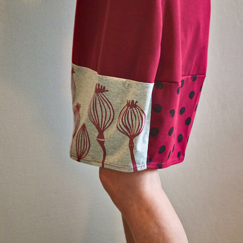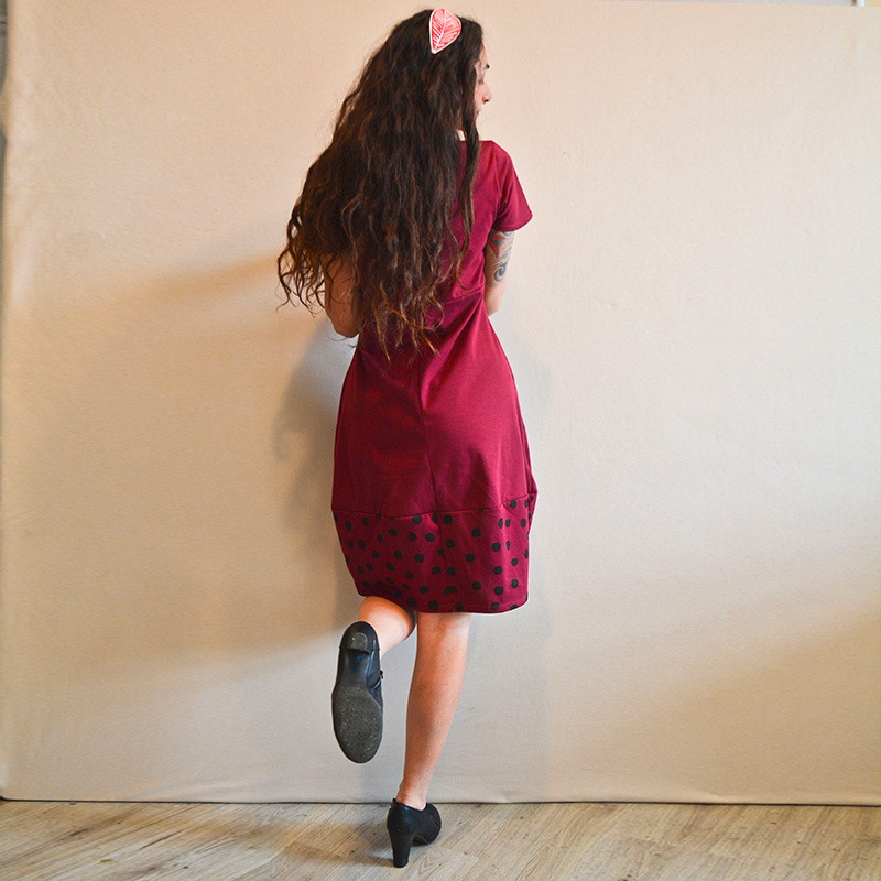 Abito in tessuto di JERSEY 100% COTONE BIO, color bordeaux, falda con stampa pois nera di JERSEY 100%COTONE BIO con manica corta, fasciato sul fianco e una silhouette a palloncino nella parte inferiore che presenta tessuti misti e stampe realizzati a mano con tecnica di linoleografia per un tocco di originalitร . Il tessuto elasticizzato lo rende comodo e ideale per la stagione primaverile/estiva. Il jersey di cotone biologico conferisce morbidezza e sostenibilitร al capo, disponibile in diverse taglie e colori. Una piccola opera d’arte su tessuto da indossare in ogni occasione, dalla passeggiata in cittร al cocktail party estivo Prodotto…