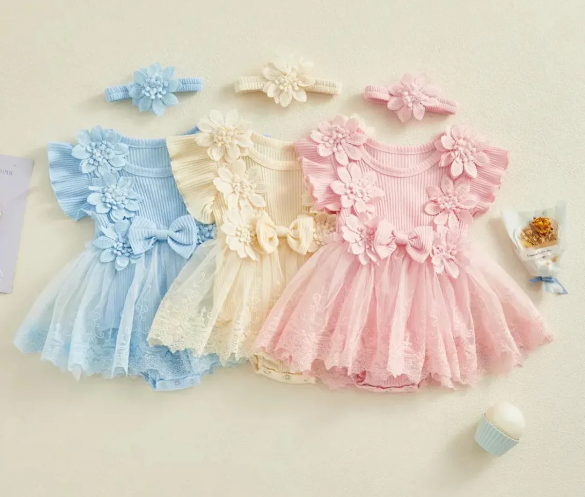 - Accessori Coordinati: Ogni abito viene fornito con una fascia abbinata decorata con fiori, per completare il look da sogno della tua bambina.