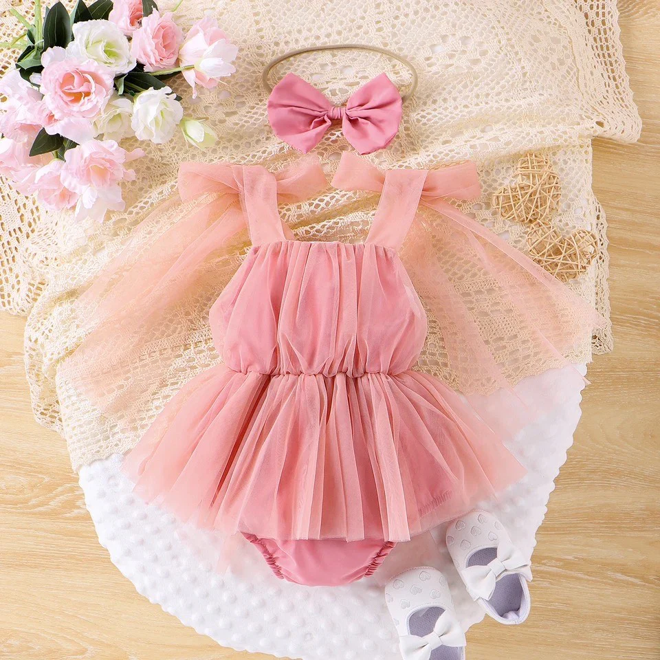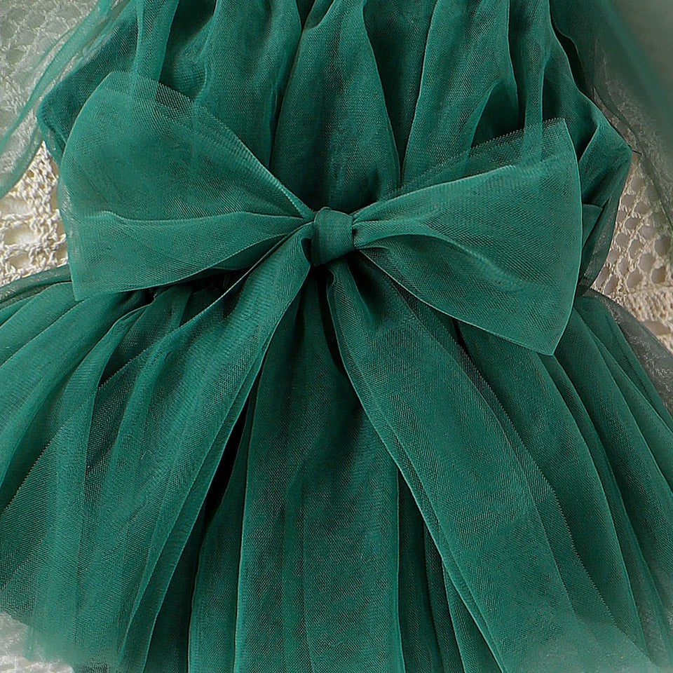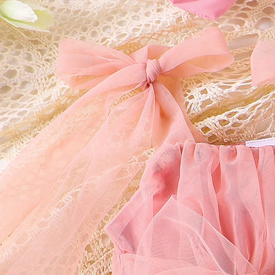Delizioso abito da bambina in tulle rosa, perfetto per occasioni speciali come cerimonie e feste. L’abito presenta spalline in tulle che si trasformano in fiocchi decorativi sulle spalle, aggiungendo un tocco elegante e raffinato. La gonna a balze crea un effetto vaporoso e sognante. Completa l’outfit un grazioso cerchietto con fiocco in tessuto rosa coordinato.