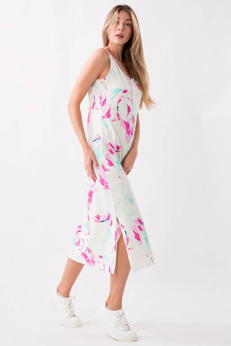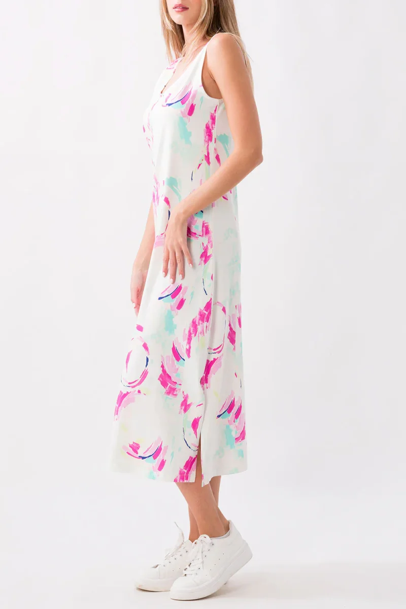 Abito lungo senza maniche con doppio spacco laterale dalle linee fluide. Realizzato con una stampa all-over multicolor rappresentante una grafica astratta che ricorda delle pennellate sfumate di colore. Ideale per un look elegante e alla moda che non passa inosservato.
