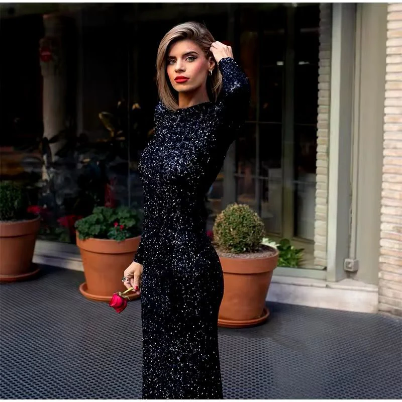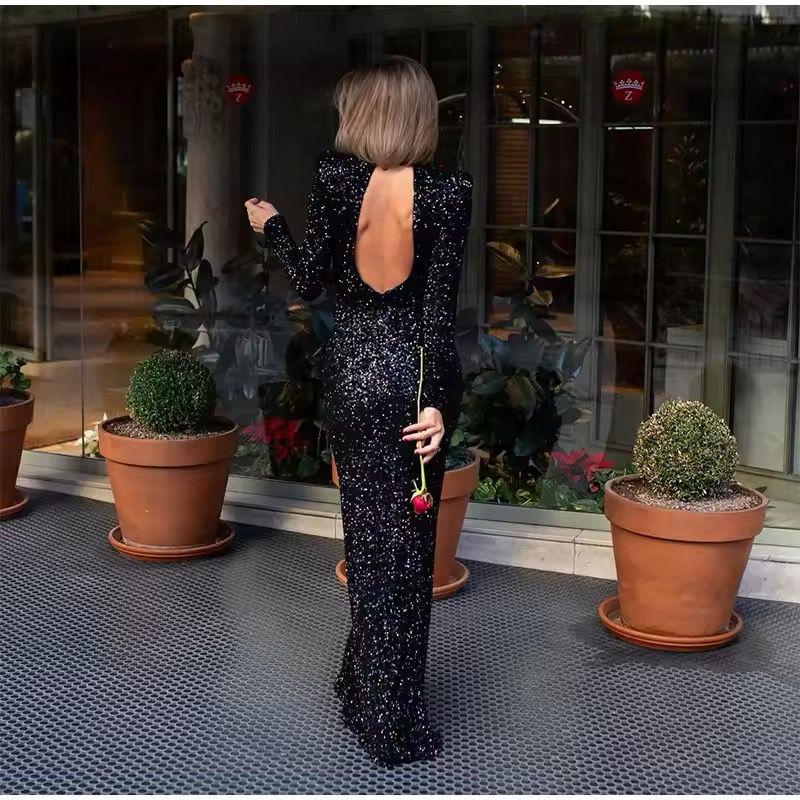 Aggiungi un tocco di eleganza senza tempo al tuo guardaroba con questo abito lungo nero decorato con paillettes scintillanti. Il design raffinato presenta una scollatura profonda sulla schiena, che esalta la silhouette e aggiunge un elemento di sorpresa e sensualitร . Perfetto per serate di gala e occasioni formali, questo abito combina classe e glamour, rendendoti la protagonista di ogni evento. La parte posteriore scoperta e la silhouette aderente creano un look sofisticato e femminile, mentre le paillettes catturano la luce, garantendo che ogni tuo passo sia un vero spettacolo.