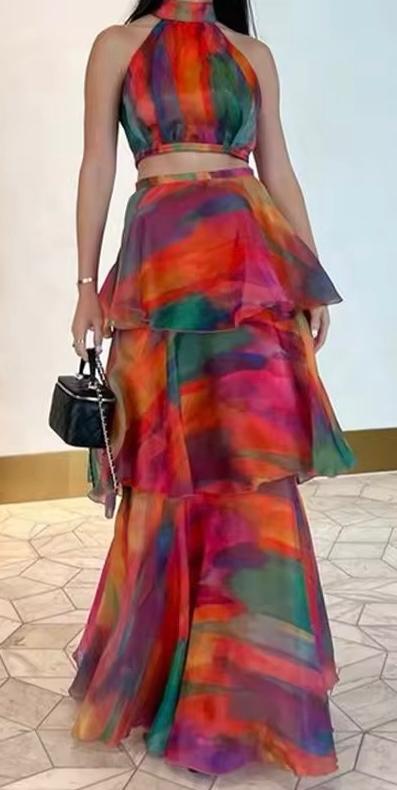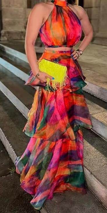Esprimi la tua personalitร con questo splendido abito lungo multicolore. Realizzato in tessuto leggero e fluttuante, presenta un top allacciato al collo e una gonna a piรน strati con volant per un effetto dinamico e sofisticato. Perfetto per occasioni speciali, eventi serali o una serata estiva, questo abito garantisce un look mozzafiato che cattura l’attenzione. Disponibile in diverse taglie.