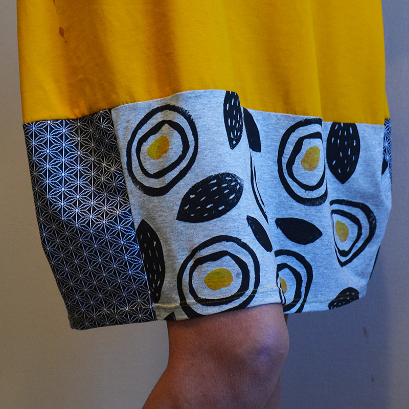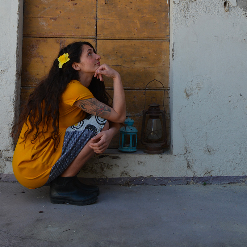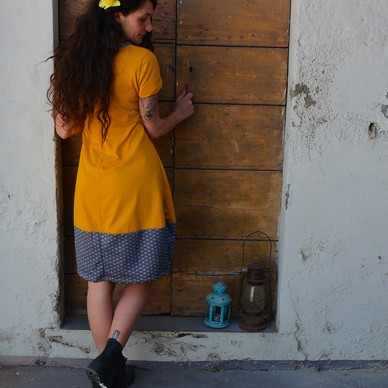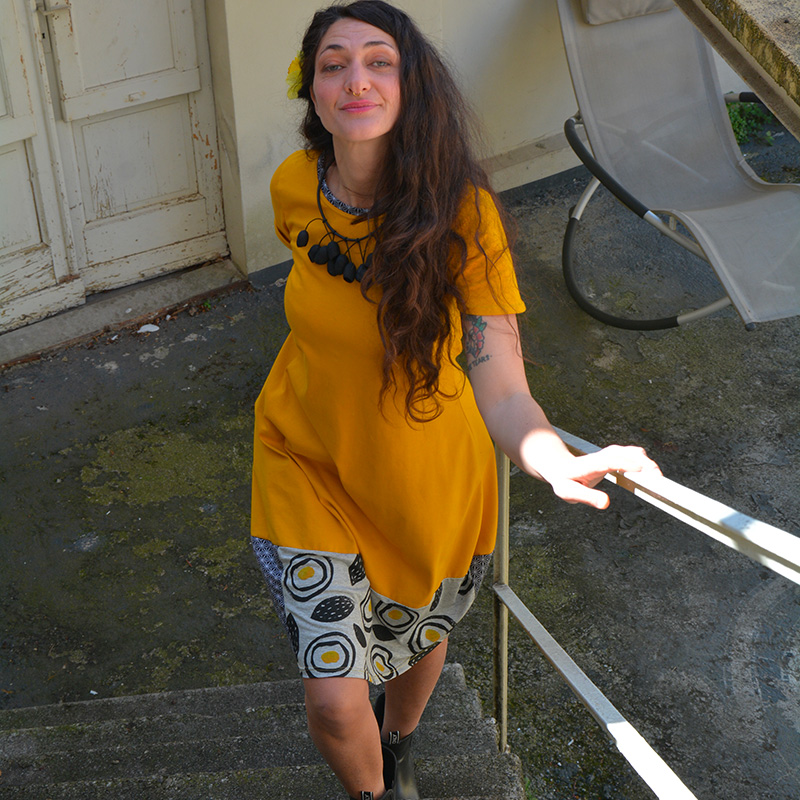 Abito in tessuto di JERSEY 100%COTONE BIO, color ocra, falda tessuto in fantasia jersey 80%COTONE/20%ACRILICO,con manica corta, fasciato sul fianco e una silhouette a palloncino nella parte inferiore che presenta tessuti misti e stampe realizzati a mano con tecnica di linoleografia per un tocco di originalitร . Il tessuto elasticizzato lo rende comodo e ideale per la stagione primaverile/estiva. Il jersey di cotone biologico conferisce morbidezza e sostenibilitร al capo, disponibile in diverse taglie e colori. Una piccola opera d’arte su tessuto da indossare in ogni occasione, dalla passeggiata in cittร al cocktail party estivo Prodotto esente da ulteriori sconti con…
