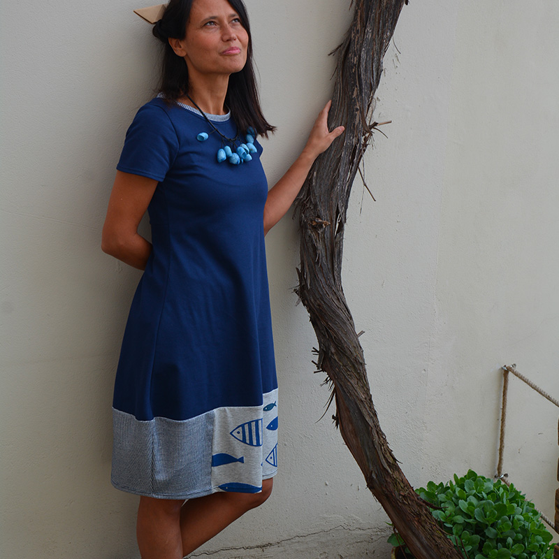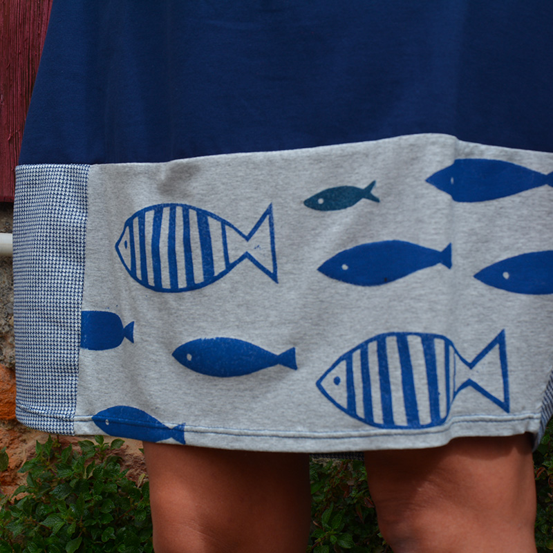 Abito in tessuto di JERSEY 100%COTONE BIO, color blu Navy, falda tessuto jacquard fantasia in 50%COTONE/50%LINOcon manica corta, fasciato sul fianco e una silhouette a palloncino nella parte inferiore che presenta tessuti misti e stampe realizzati a mano con tecnica di linoleografia per un tocco di originalitร . Il tessuto elasticizzato lo rende comodo e ideale per la stagione primaverile/estiva. Il jersey di cotone biologico conferisce morbidezza e sostenibilitร al capo, disponibile in diverse taglie e colori. Una piccola opera d’arte su tessuto da indossare in ogni occasione, dalla passeggiata in cittร al cocktail party estivo Prodotto esente da ulteriori sconti…