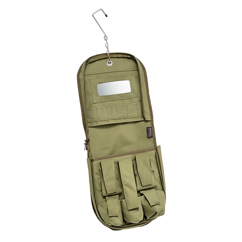 Tactical beauty case grande, realizzato in tessuto resistente e impermeabile e bordato. Si ripiega su se stesso con chiusura a gancio metallico e maniglia per trasporto. • Chiuso cm 27×31 • Aperto cm 27×65 • 1 tasca principale apera • 6 mini scomparti separati tra loro • 5 multi tasche con chiusura bloccante a velcro • 1 gancio per appenderlo • Peso: 500 gr Peso: 500 gr