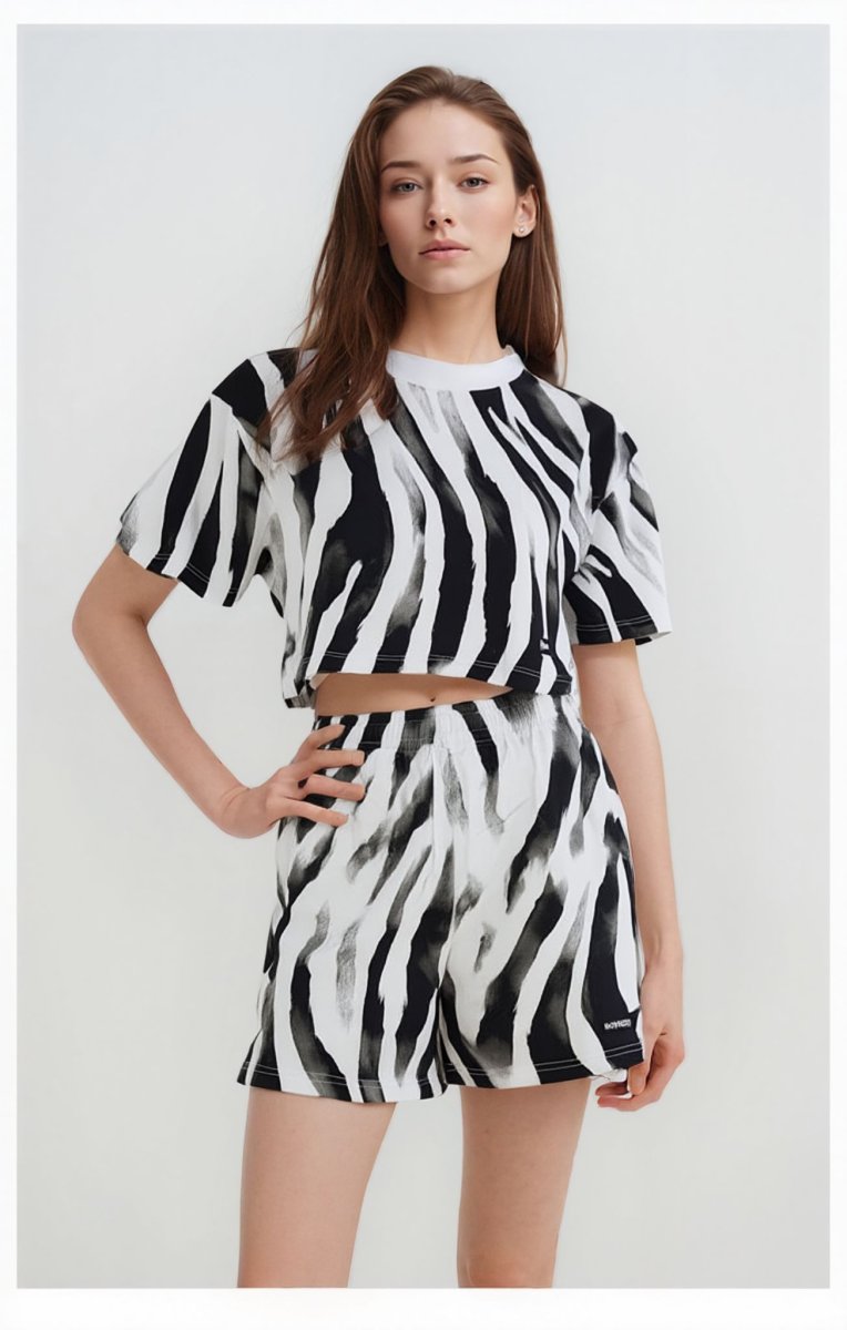 Distinguiti con stile grazie a questi bermuda da donna firmati SHOE. Realizzati in 100% cotone, offrono comfort e traspirabilitร ideali per la stagione calda. Il design in fantasia โWavesโ presenta un’elegante stampa zebrata nei toni del bianco e nero, perfetta per chi ama osare con originalitร . Tessuto: 100% cotone Vestibilitร : Regolare con elastico in vita per una maggiore comoditร Stampa: Zebrata โWavesโ Colore: Bianco/Nero Made for: Look casual, streetwear e tempo libero Abbinali al top coordinato per un total look deciso e contemporaneo.