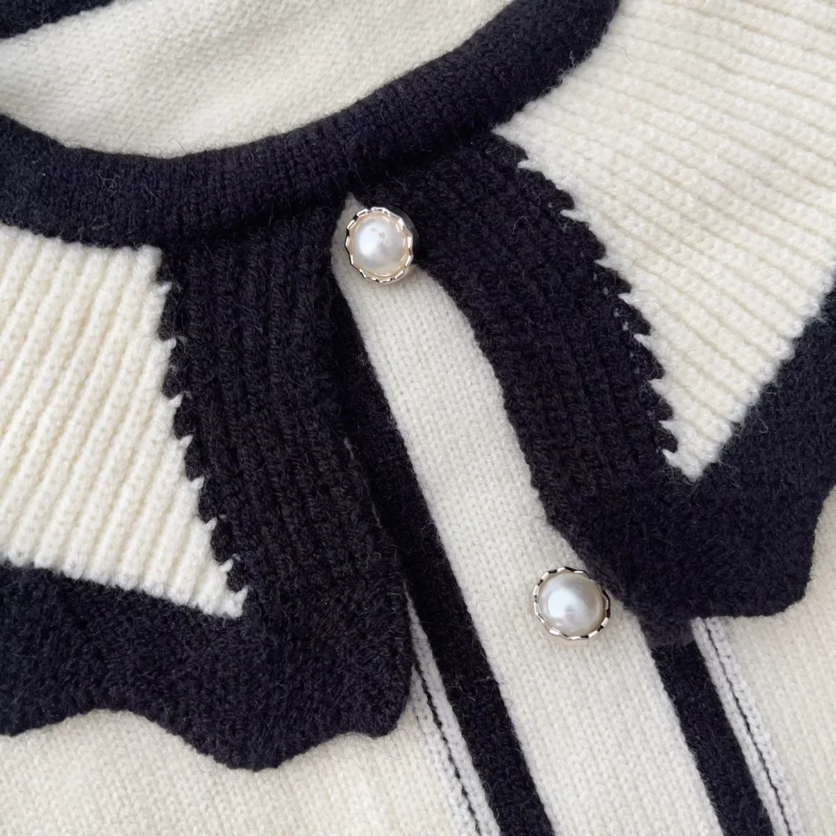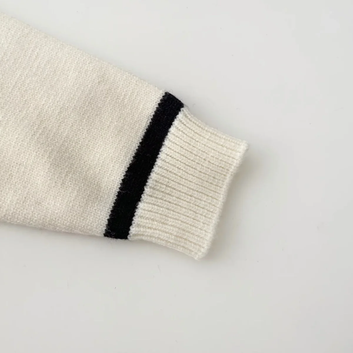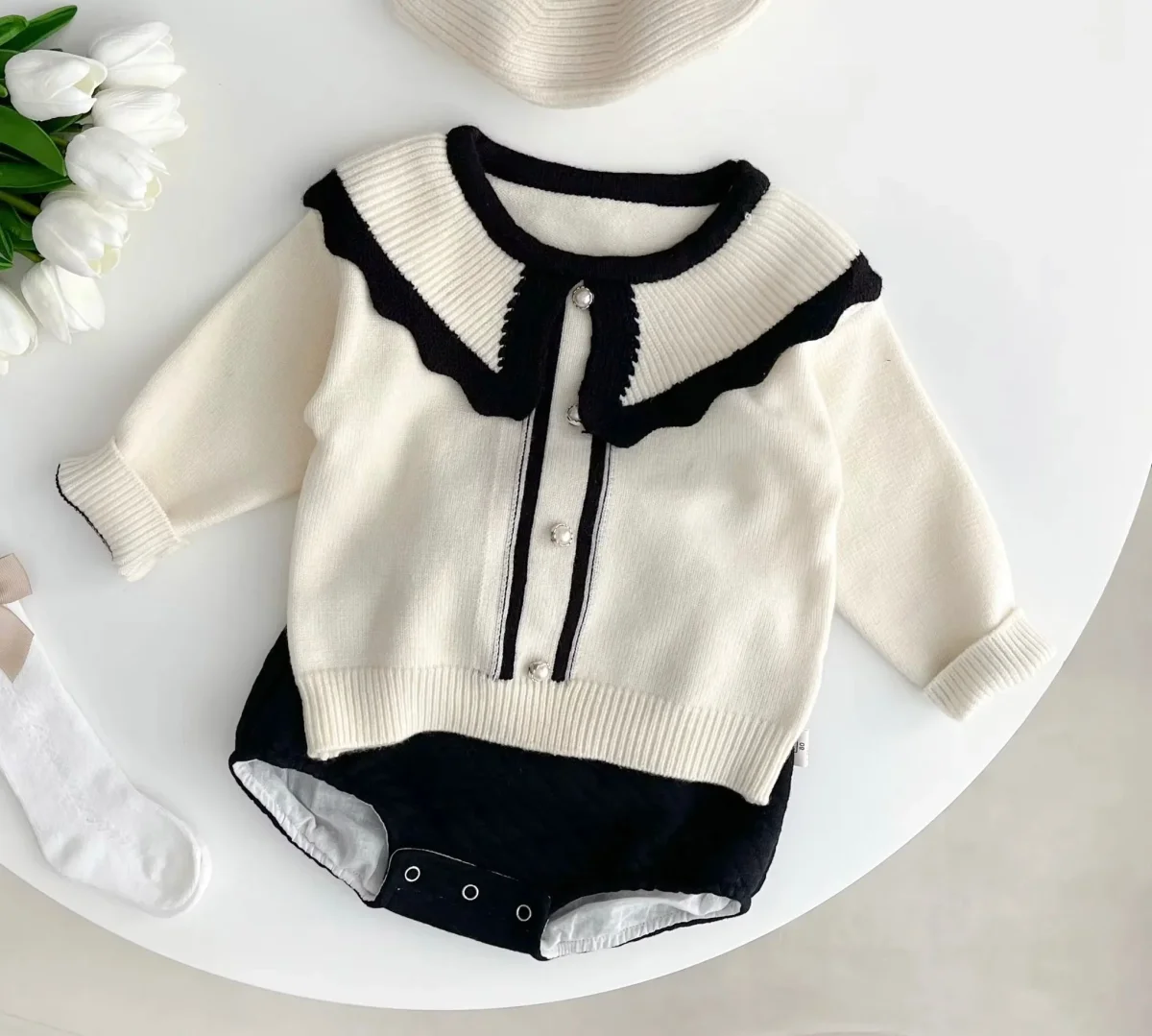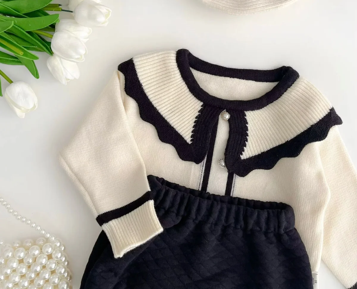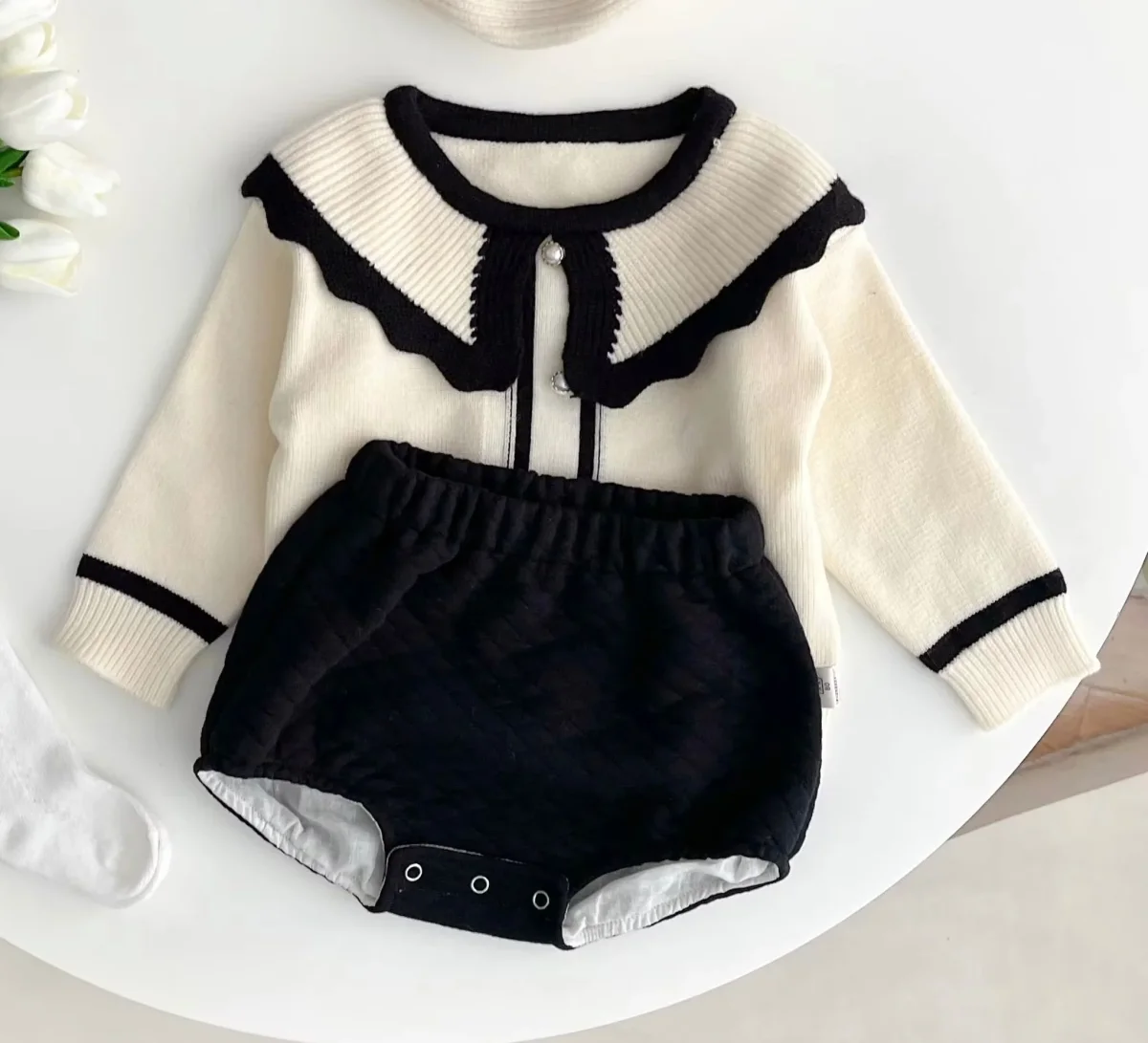 Questo delizioso completo per bambina รจ perfetto per un look chic e confortevole. Il set include un maglione in maglia color crema con dettagli neri sul colletto, sui polsini e lungo il centro frontale. Il secondo pezzo รจ un paio di pantaloncini trapuntati neri con vita elastica e chiusure a scatto al cavallo per una vestizione facile. Questo outfit รจ ideale per le piccole fashioniste che desiderano essere alla moda e comode in ogni occasione.
