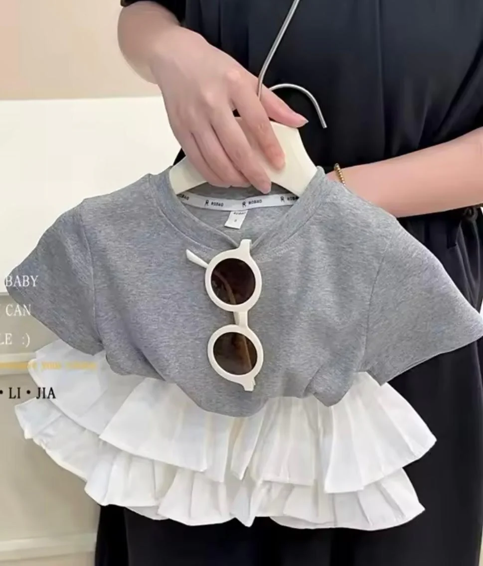 Questo adorabile completo casual per bambina รจ perfetto per le giornate estive. La t-shirt grigia, dal taglio moderno e con dettagli a strati, si abbina splendidamente alla gonna bianca con volant, creando un look fresco e alla moda. Realizzato in morbido cotone, questo set garantisce il massimo comfort e libertร di movimento per la tua bambina. Ideale per giochi all’aperto, passeggiate in cittร o semplicemente per un look trendy e confortevole.