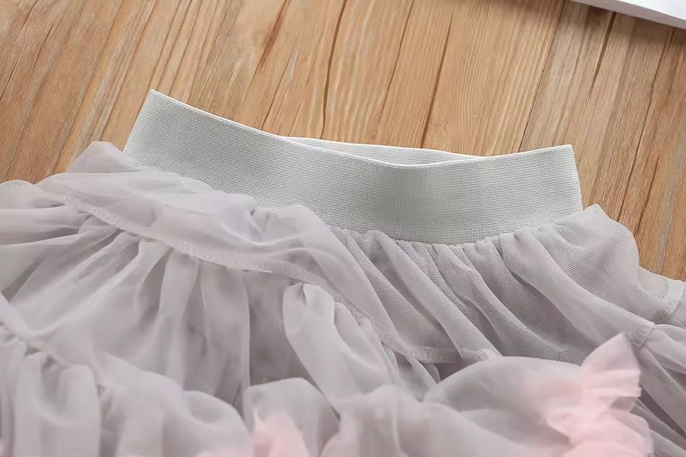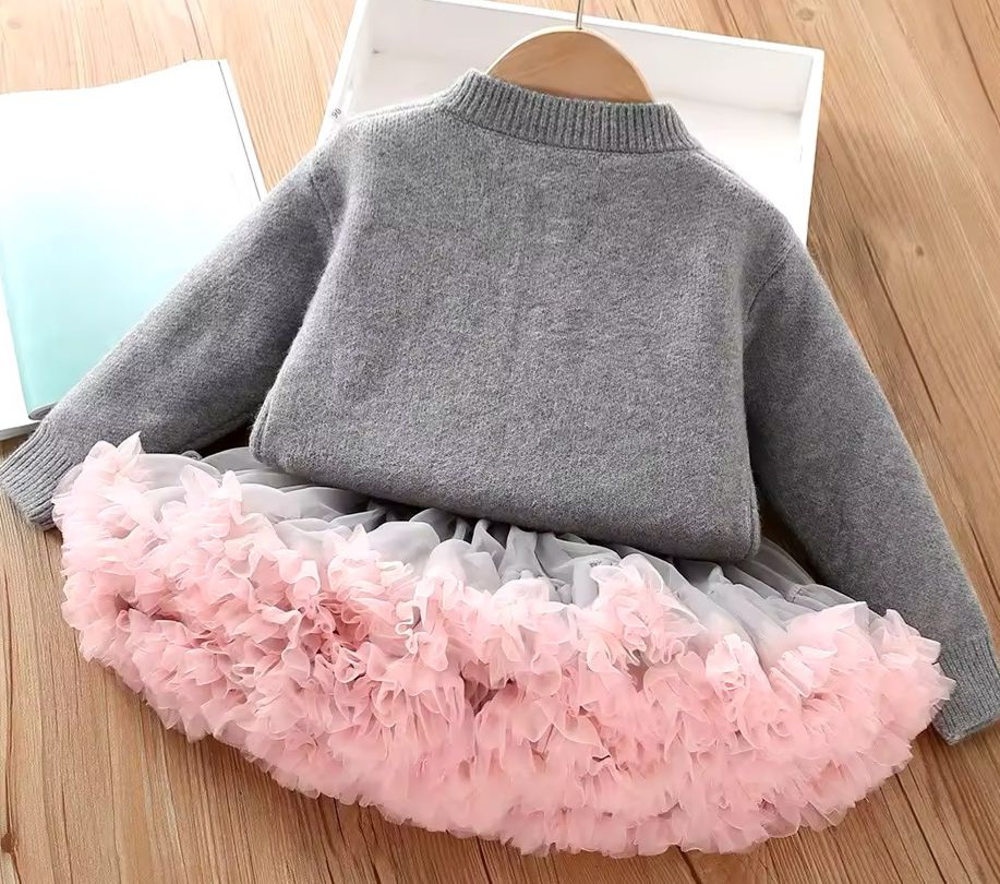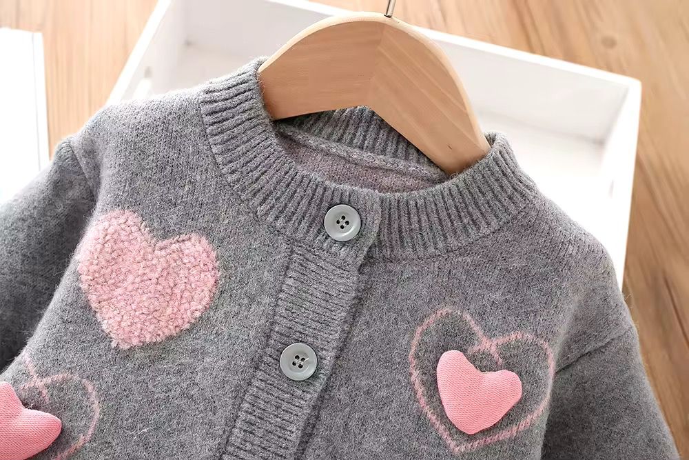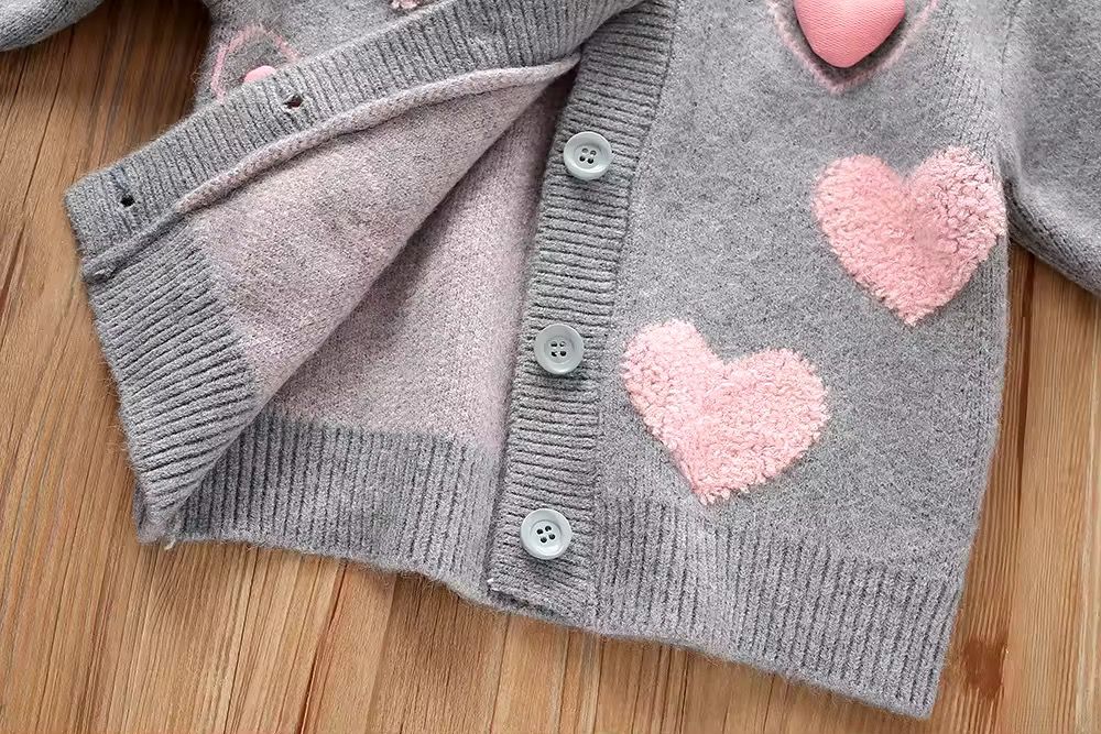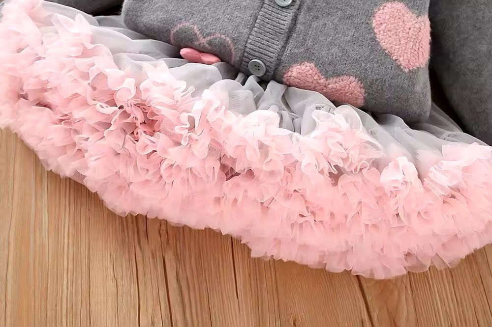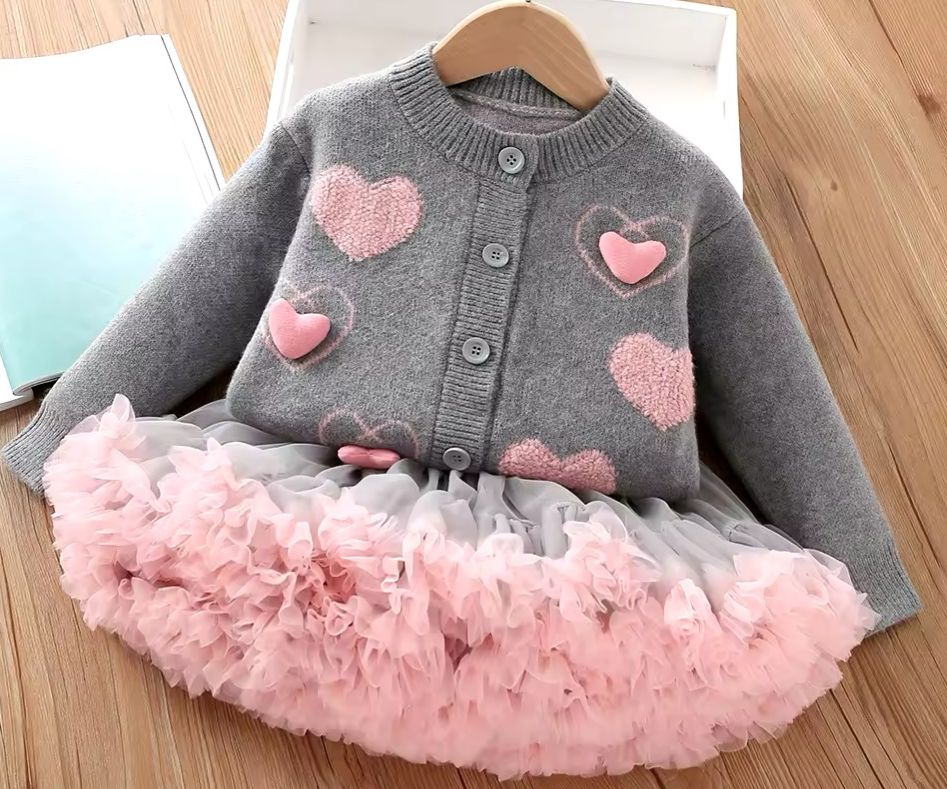 Questo adorabile completo da bambina รจ composto da due pezzi: un cardigan e una gonna in tulle. Il cardigan, realizzato in morbido tessuto, presenta cuori rosa applicati sul davanti, aggiungendo un tocco di dolcezza e stile. La chiusura frontale con quattro bottoni grigi facilita l’indossamento. La gonna in tulle รจ vaporosa e arricciata, creando un effetto voluminoso e romantico, perfetto per occasioni speciali o per un look quotidiano elegante.