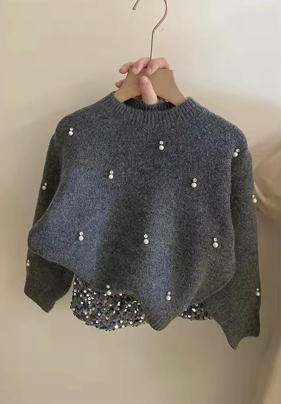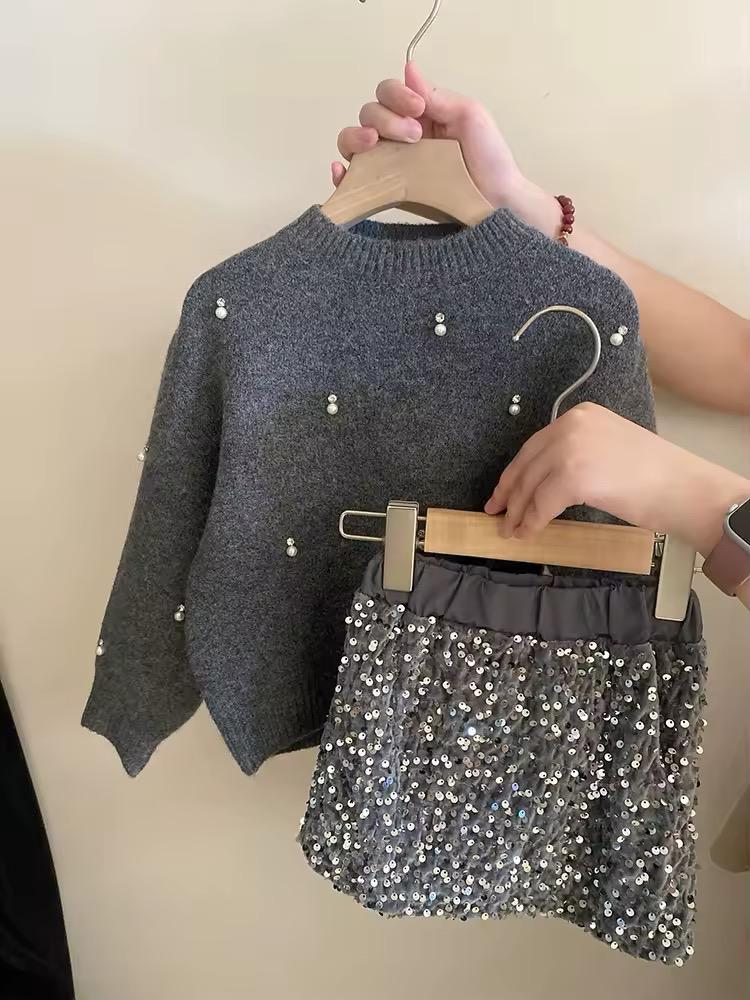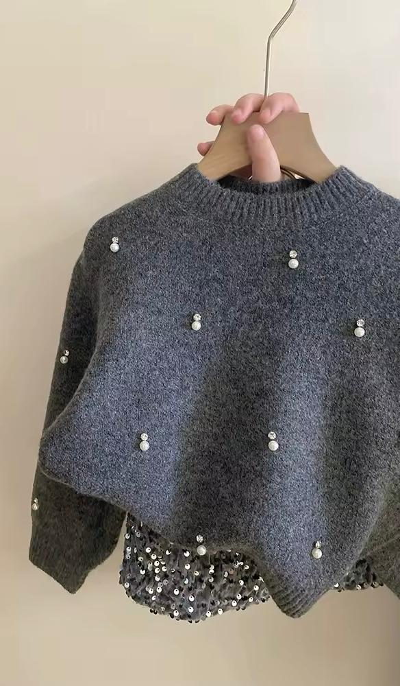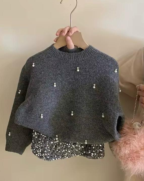 Il Maglione ideale per offrire comfort e calore durante le giornate piรน fresche. Decorato con piccole perle bianche distribuite uniformemente su tutta la superficie, aggiungendo un tocco di eleganza e raffinatezza. La gonna Realizzata in tessuto grigio imbottito per assicurare calore, con una ricca copertura di paillettes argentate che donano un effetto scintillante. Design corto e ampio per una maggiore libertร di movimento e comfort. Questo completo รจ ideale per occasioni speciali come feste di compleanno, cene in famiglia o qualsiasi evento in cui la tua bambina voglia sentirsi speciale. La combinazione tra il maglione semplice e la gonna scintillante crea un contrasto perfetto che non passerร inosservato.