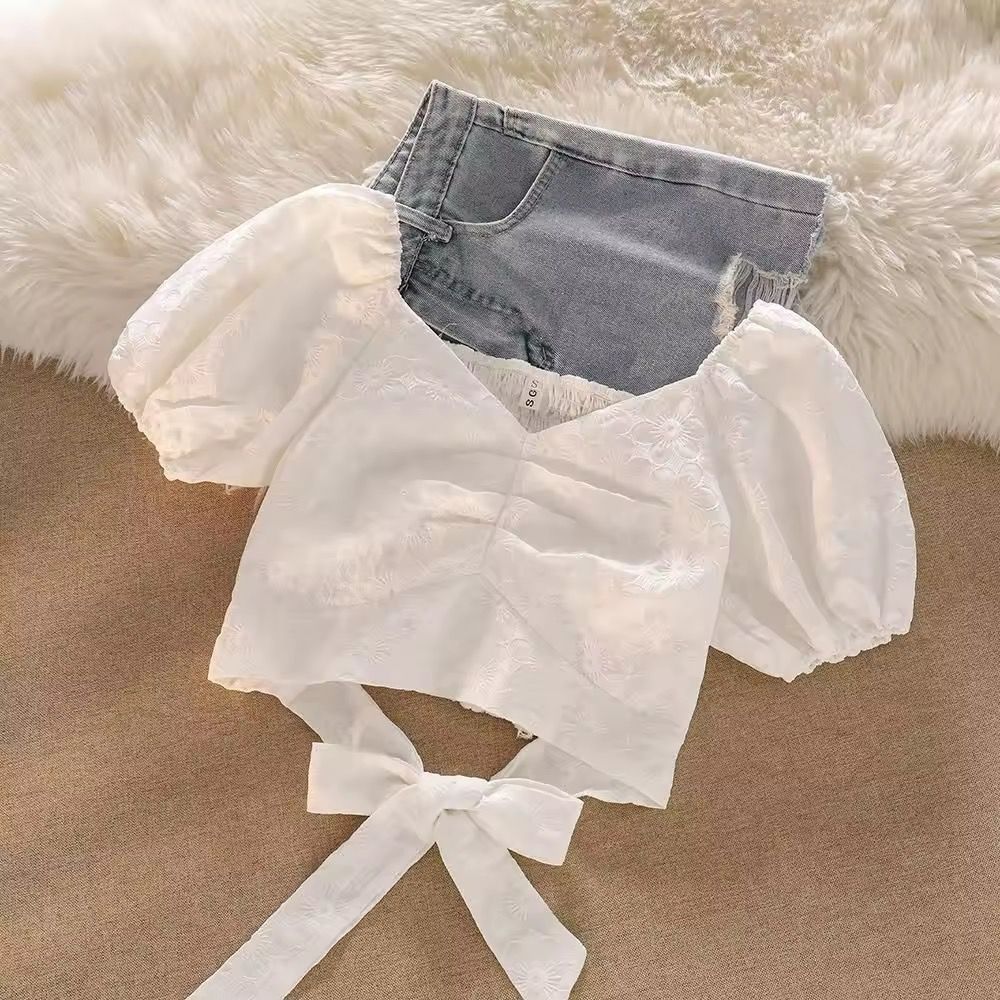 Un look fresco e alla moda per le giornate estive! Il completo โRomantic Denimโ include un top bianco con maniche a sbuffo e fiocco laterale, abbinato a shorts in denim con dettagli strappati. Perfetto per piccole fashion lover che amano sentirsi comode e stilose. Ideale per passeggiate, feste e momenti speciali.