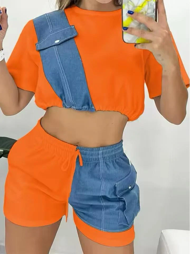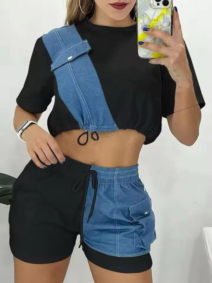 Esplora un look unico e alla moda con il nostro Completo Sportivo Casual con Dettagli in Denim. Questo set include una maglietta corta con un elegante inserto diagonale in denim e pantaloncini abbinati che combinano tessuto e denim per un effetto sorprendente. Il top presenta un design crop con cordino regolabile, mentre i pantaloncini offrono comfort e stile con una comoda fascia elastica in vita e tasche pratiche. Perfetto per un look casual ma ricercato, ideale per passeggiate, attivitร sportive o momenti di relax. Disponibile in diverse taglie per adattarsi perfettamente al tuo stile.