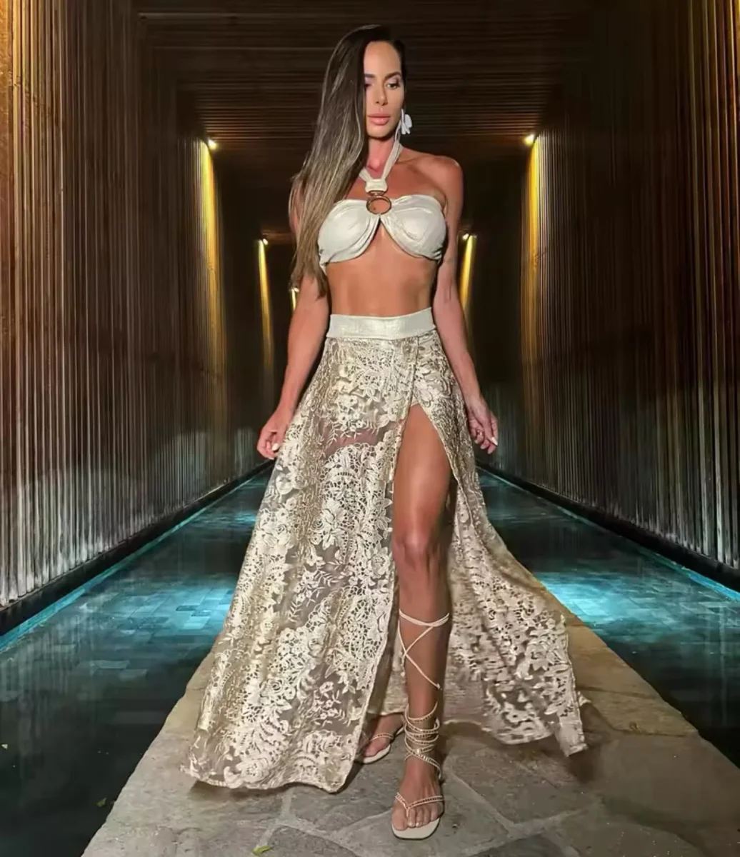 Incanta tutti con questo splendido abito da sera, perfetto per occasioni speciali e serate indimenticabili. Il design distintivo di questo abito comprende un top a fascia in satin con dettaglio centrale a cerchio, che esalta la scollatura e aggiunge un tocco di eleganza. La gonna lunga, realizzata in pizzo trasparente, presenta uno spacco frontale audace che mette in risalto le gambe, donando un effetto seducente e raffinato.La combinazione di tessuti leggeri e traspiranti garantisce comfort e stile, mentre la vita alta sottolinea la silhouette femminile. Lasciati avvolgere dalla bellezza e dalla raffinatezza di questo abito unico, perfetto per risplendere in ogni occasione
