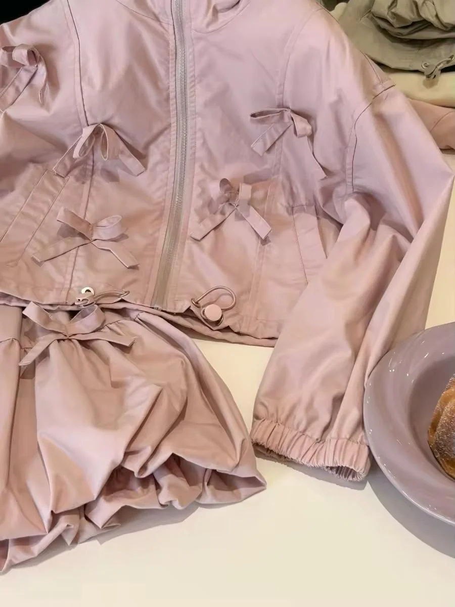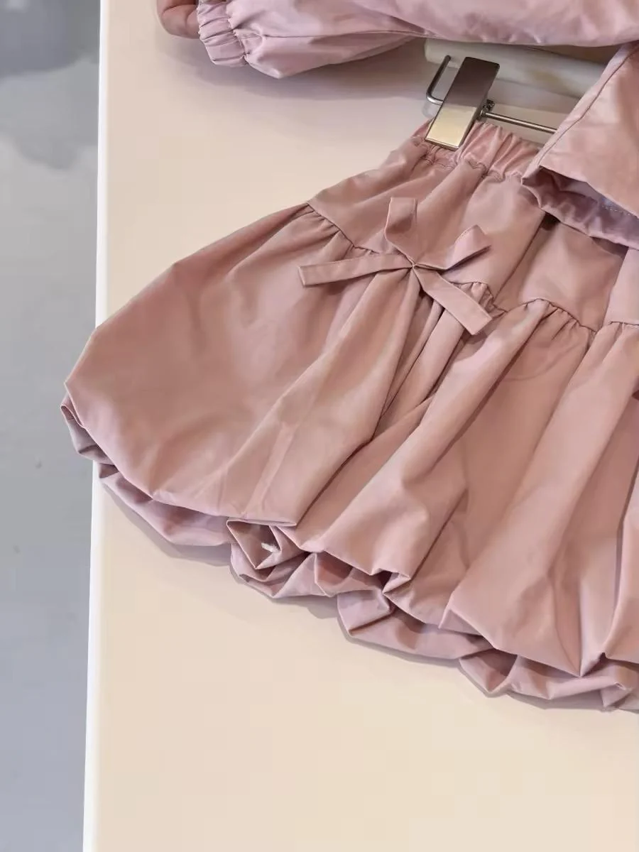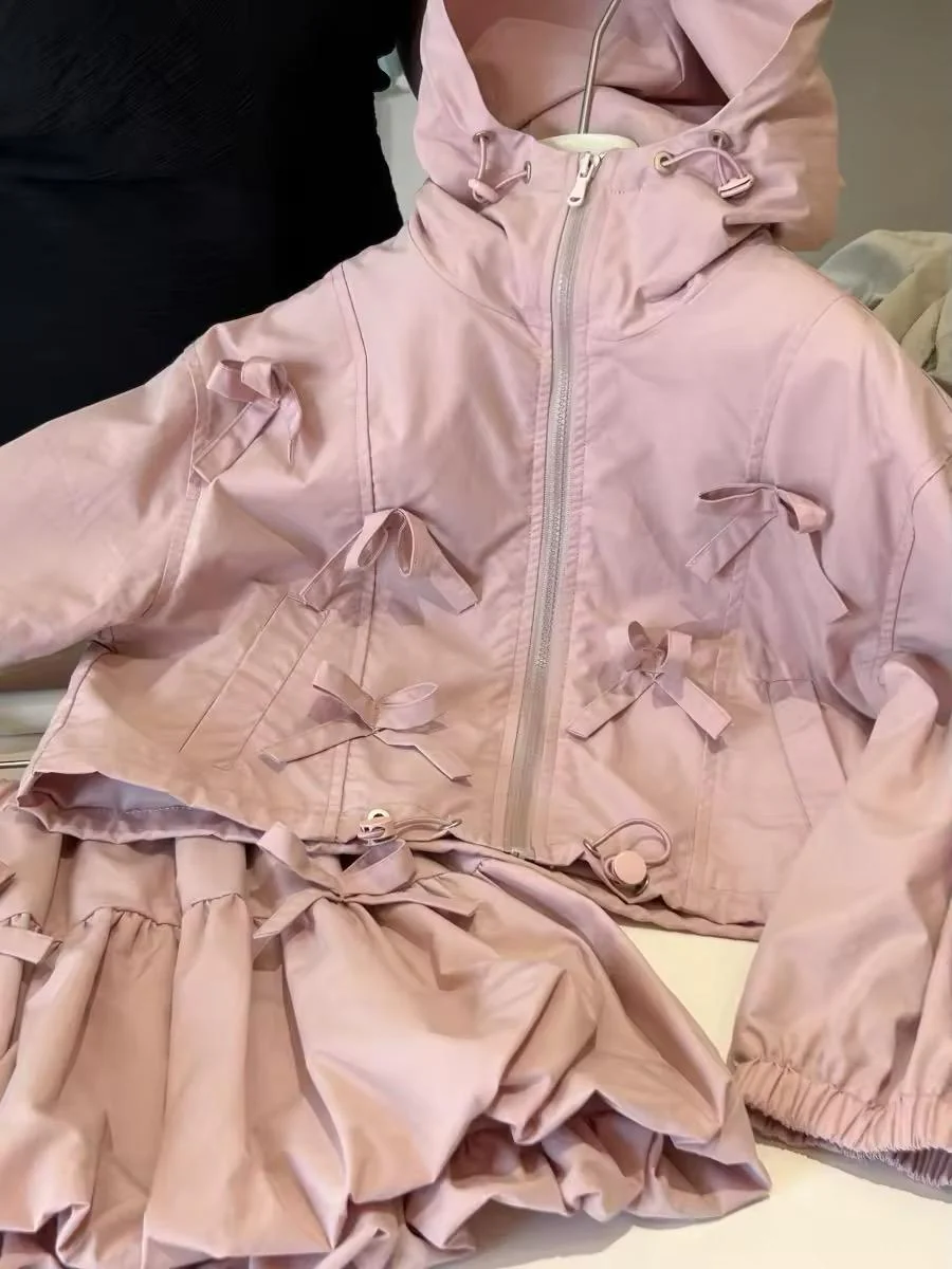 Aggiungi un tocco di dolcezza e stile al guardaroba della tua bambina con questo completo due pezzi. Composto da una giacca rosa chiaro con cappuccio, chiusura a zip e deliziosi dettagli a fiocco su maniche e davanti. La gonna abbinata, con design arricciato e fiocchi decorativi, completa questo look romantico. Realizzato con tessuti leggeri, รจ perfetto per la mezza stagione o occasioni speciali. Un mix ideale di praticitร  e raffinatezza!