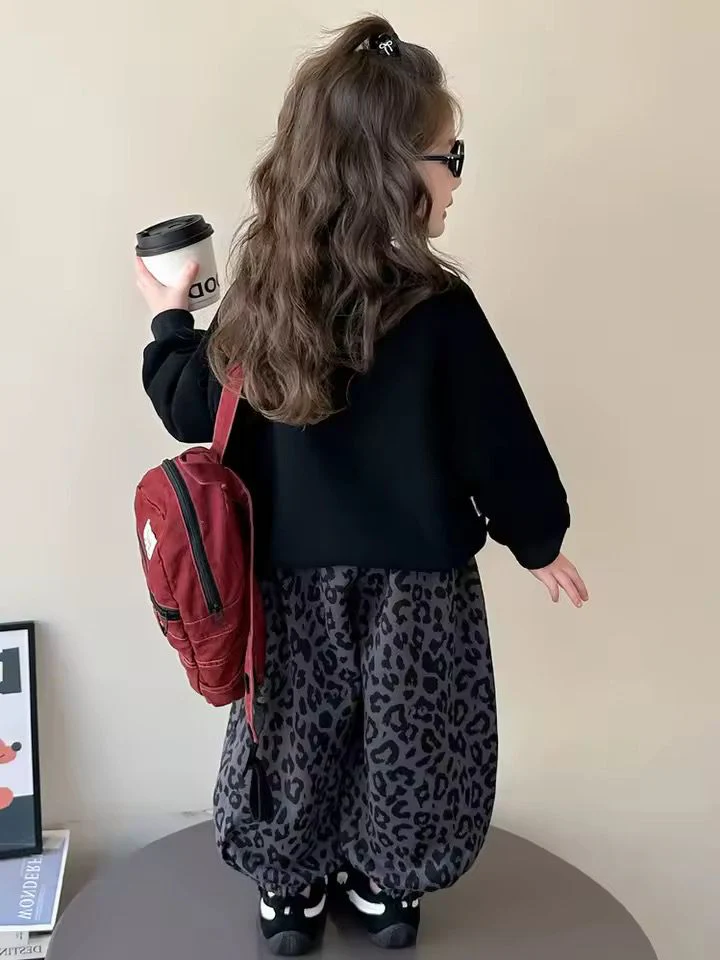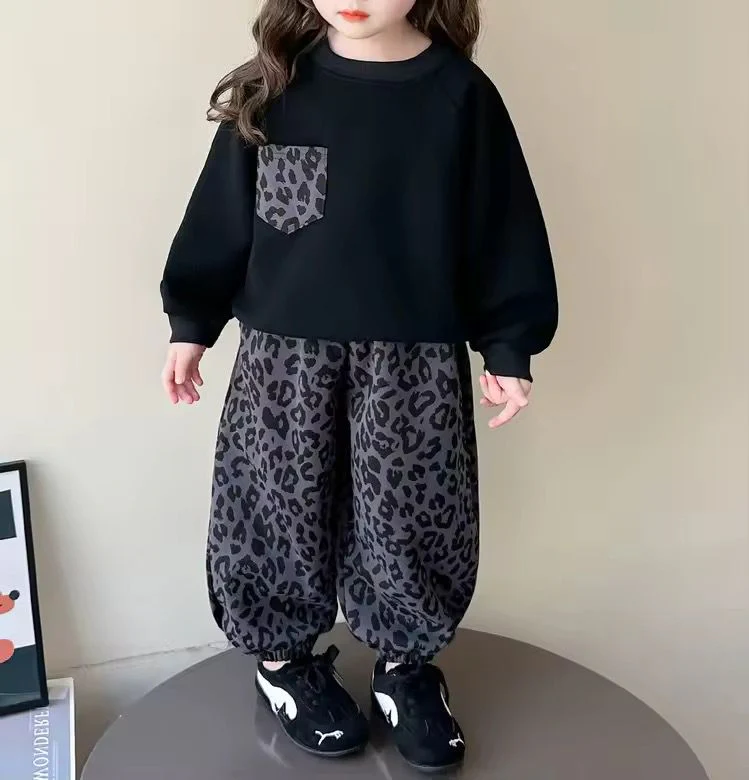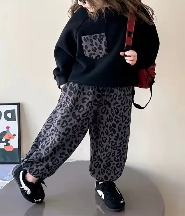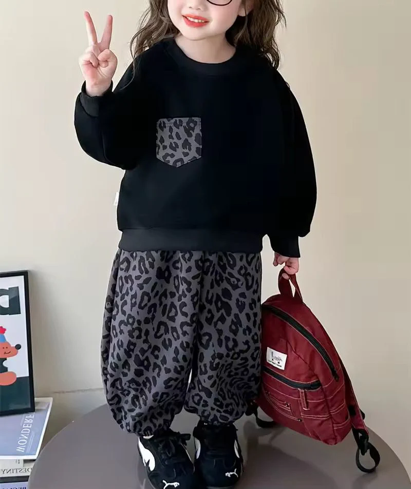 Completo due pezzi unisex composto da felpa nera con taschino frontale in stampa leopardata coordinata ai pantaloni. Design casual e moderno, ideale per ogni occasione quotidiana. Il tessuto รจ morbido e confortevole sulla pelle, garantendo libertร di movimento e stile in ogni momento. Perfetto per bambini che amano distinguersi con un tocco di carattere.