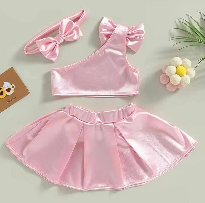 Rendi ogni giorno speciale con questo adorabile completo rosa per bambina. Il set include un top monospalla in tessuto lucido con un grande fiocco decorativo, una gonna svasata con elastico in vita e fiocco abbinato, e una fascia per capelli con fiocco coordinato. Perfetto per feste, occasioni speciali o semplicemente per far sentire la tua piccola come una vera principessa.