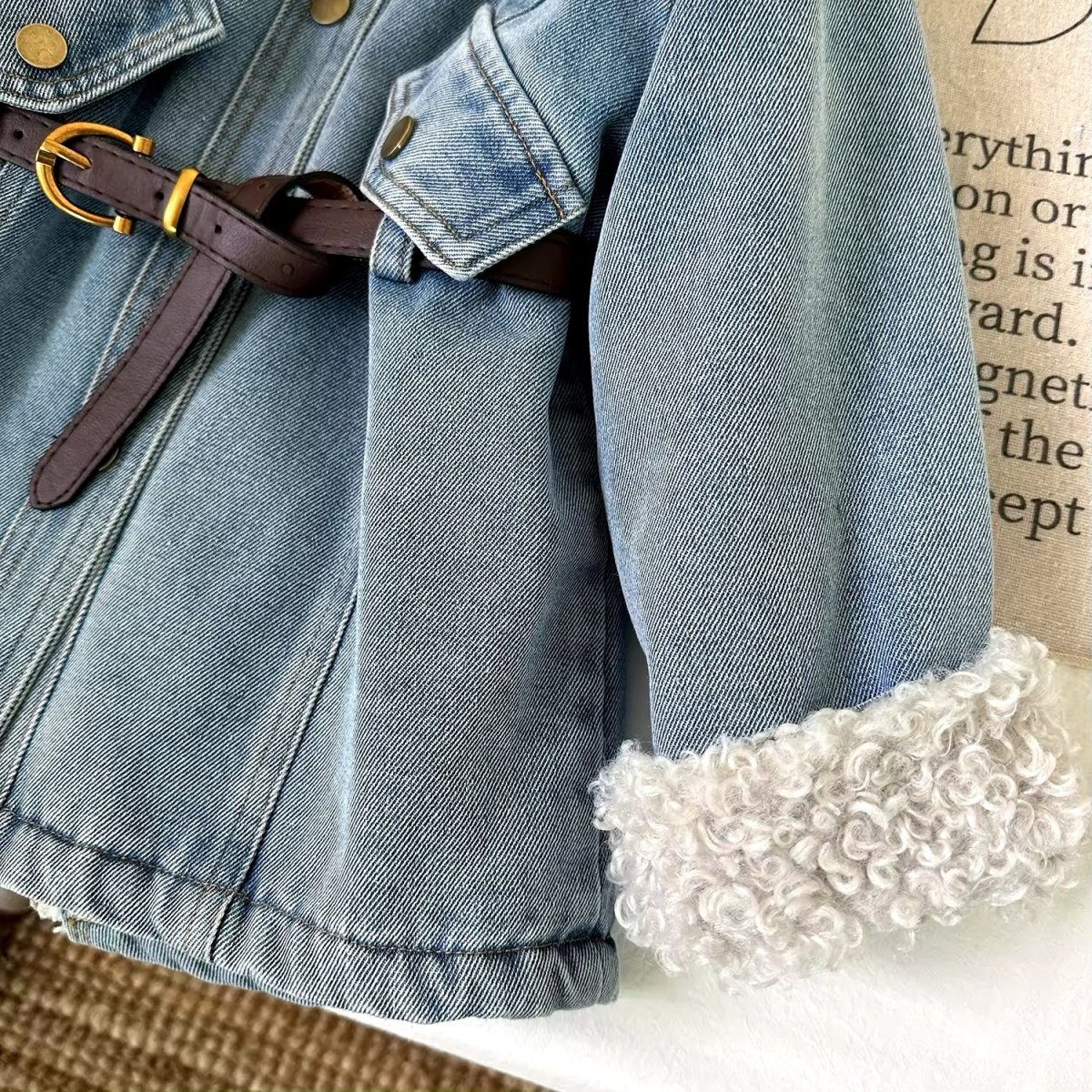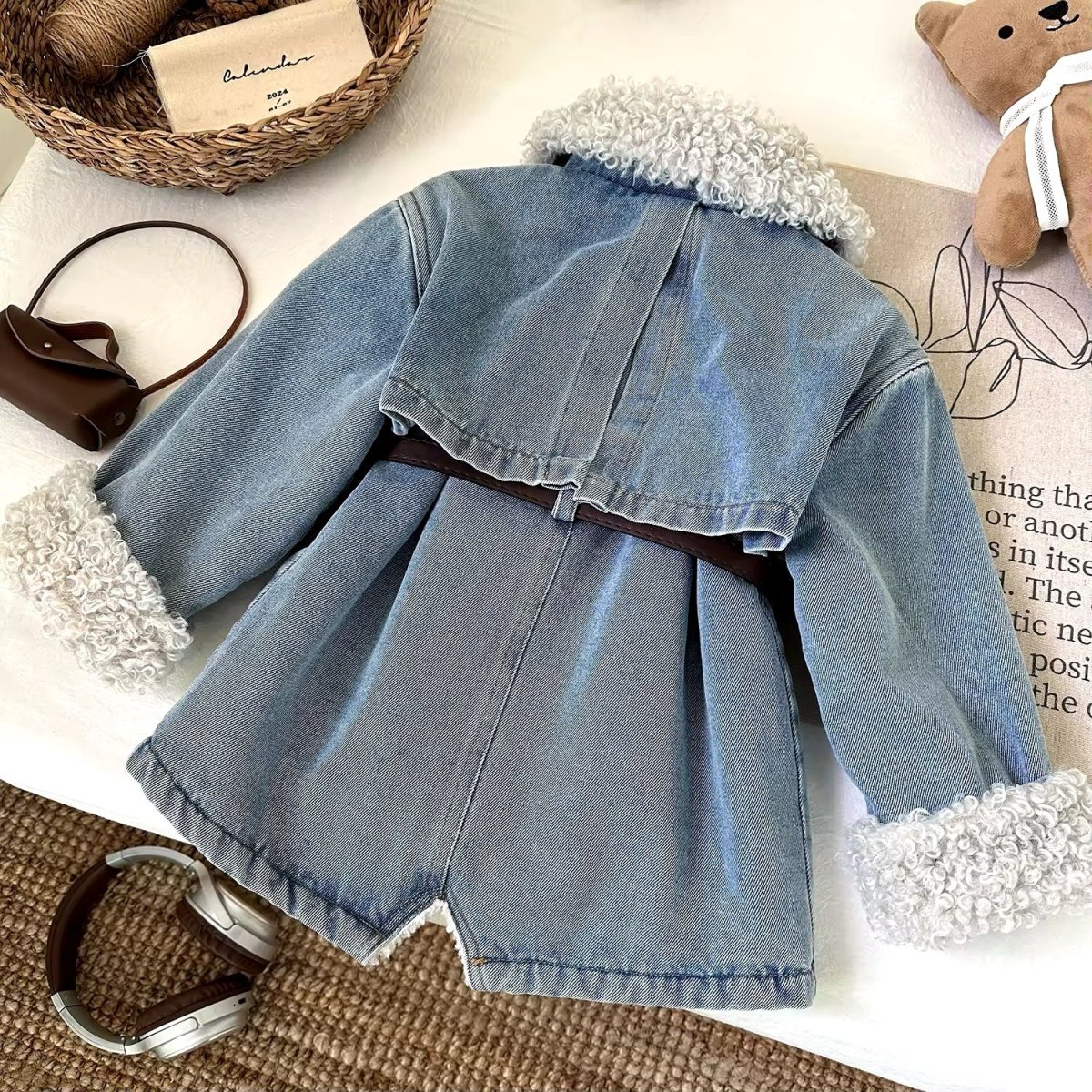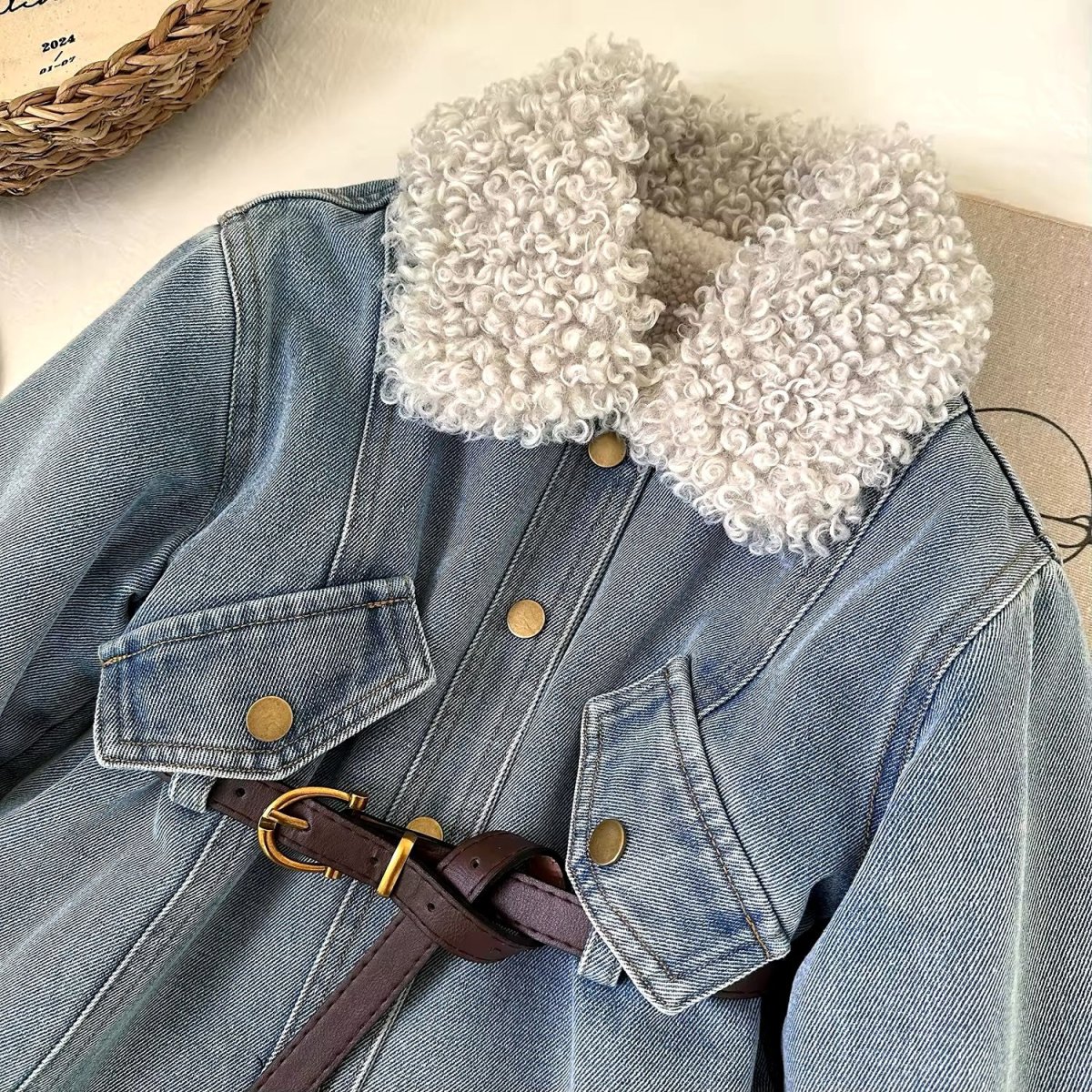 Questa giacca in denim per bambine รจ un capo di abbigliamento alla moda e funzionale, perfetto per le stagioni piรน fredde. Realizzata in tessuto di jeans di alta qualitร , la giacca presenta una fodera in pelliccia sintetica riccia che aggiunge un tocco di calore e stile. Il colletto e i polsini sono rivestiti in pelliccia sintetica, offrendo un look accogliente e alla moda. La giacca รจ dotata di due tasche frontali con bottoni a pressione dorati e una cintura in pelle marrone con fibbia dorata, che permette di regolare la vestibilitร e aggiunge un dettaglio elegante. Questo capo รจ ideale per le bambine che vogliono essere alla moda senza rinunciare al comfort.