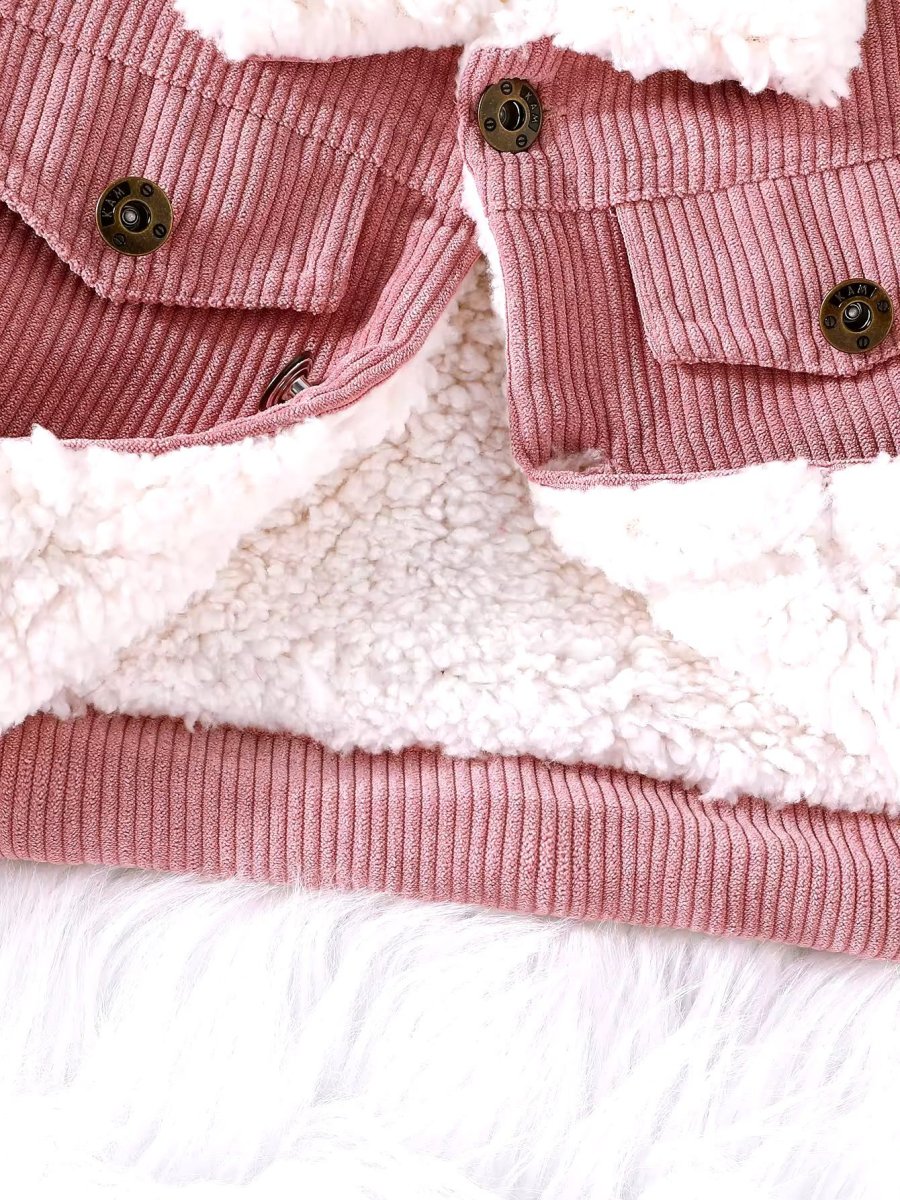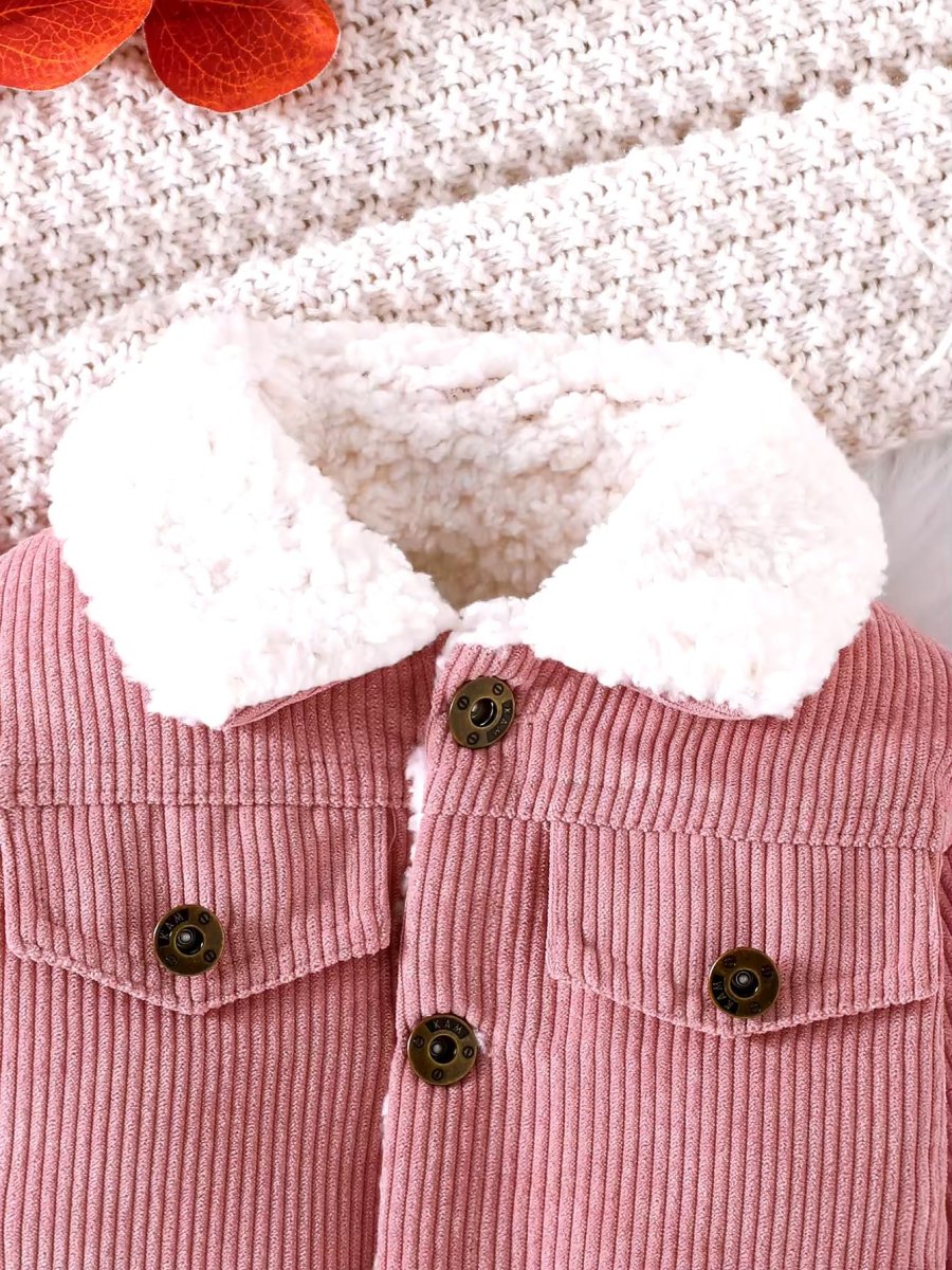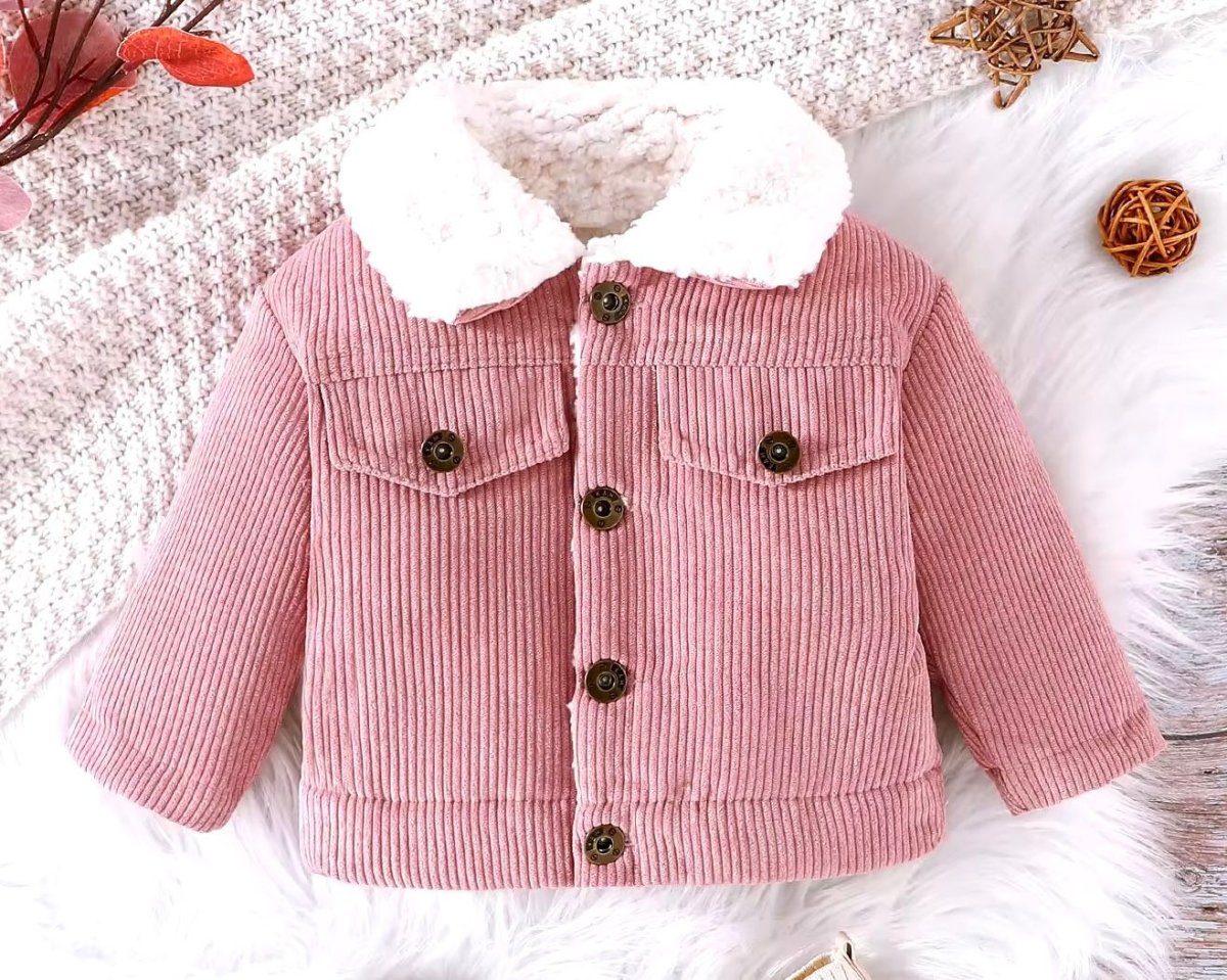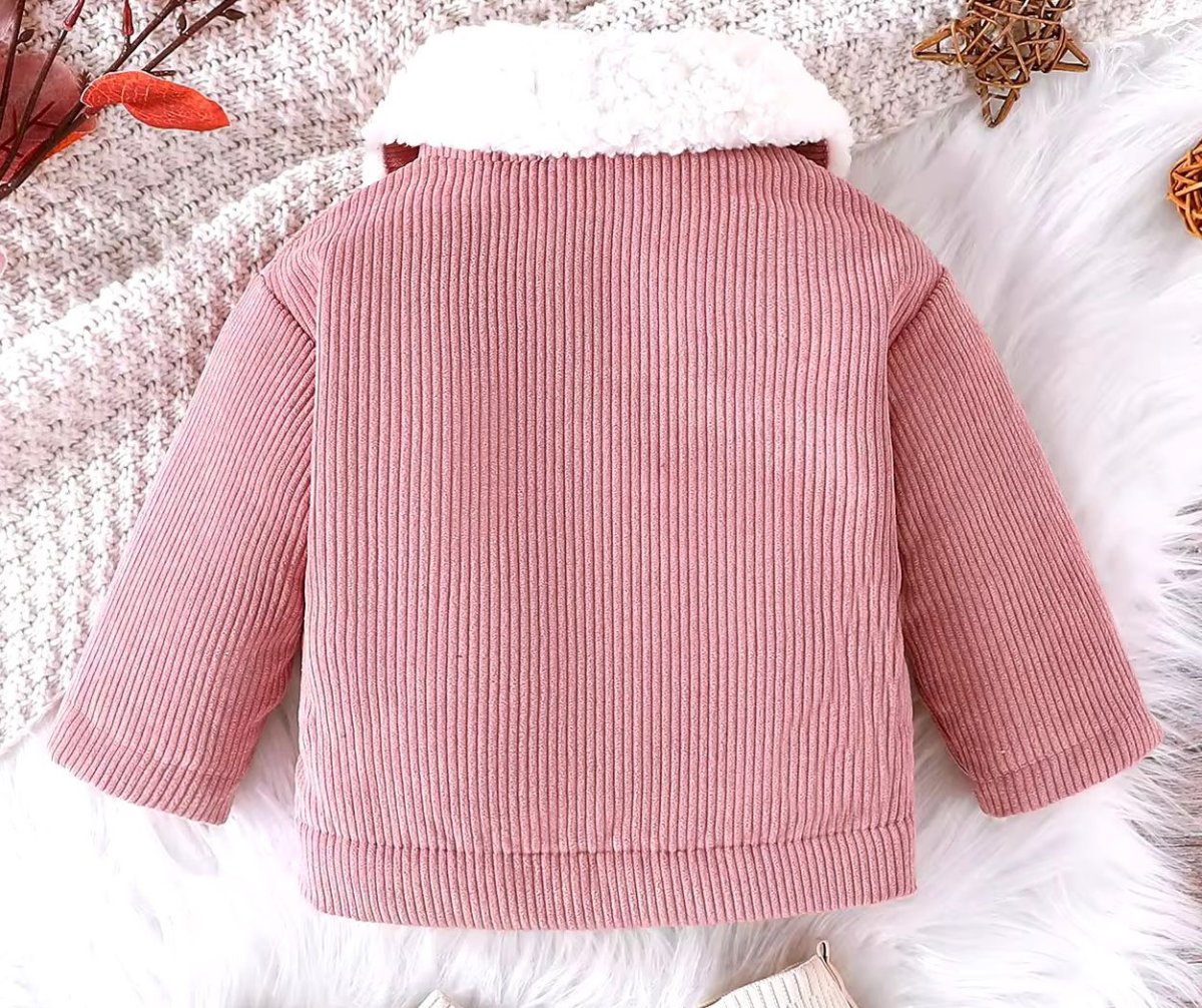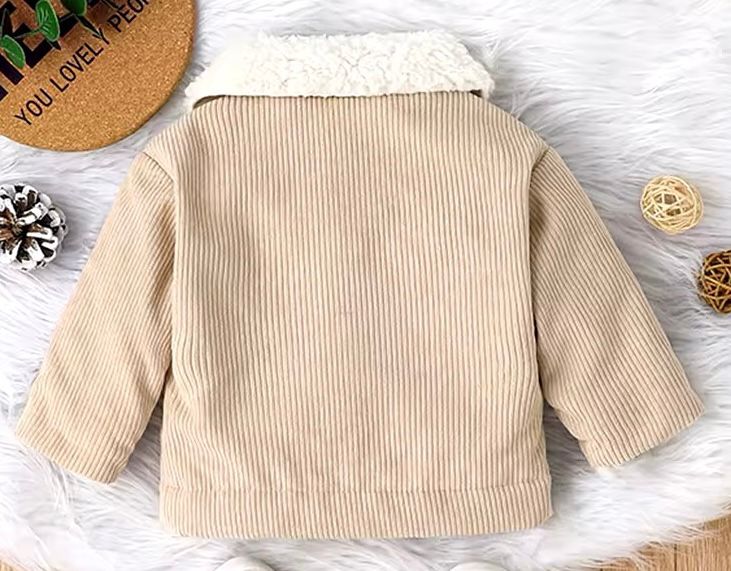 Questa adorabile giacca per bambini รจ realizzata in morbido velluto a coste. Il design presenta un colletto in pelliccia sintetica bianca che aggiunge un tocco di eleganza e calore. La giacca รจ dotata di quattro bottoni frontali marroni e due tasche con patta sul petto, anch’esse chiuse da bottoni. Le maniche lunghe e il taglio leggermente ampio garantiscono comfort e libertร di movimento, rendendola perfetta per le giornate piรน fresche. Un capo versatile e alla moda, ideale per completare qualsiasi outfit invernale.
