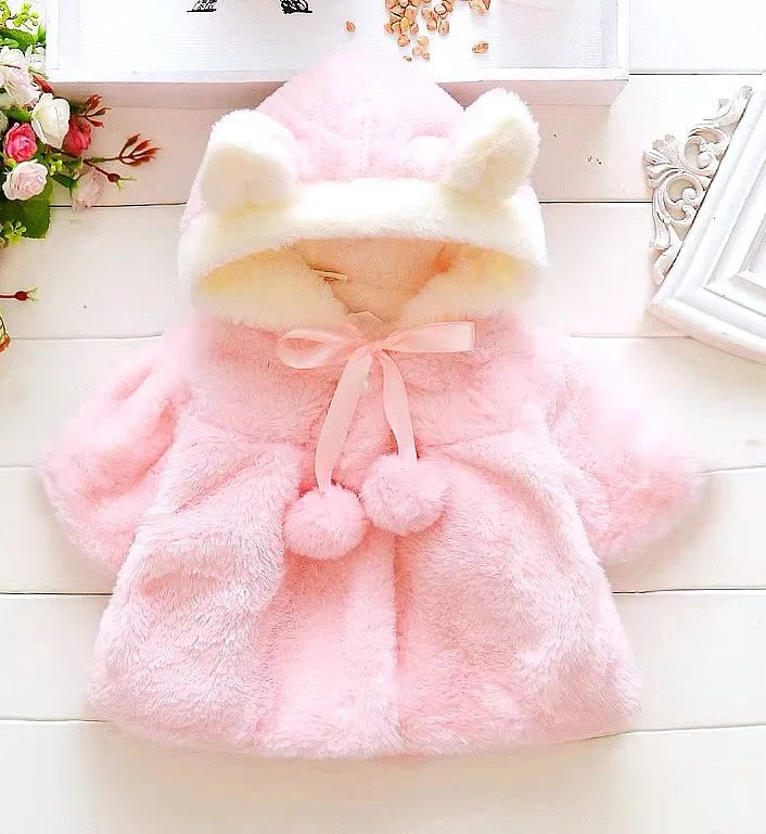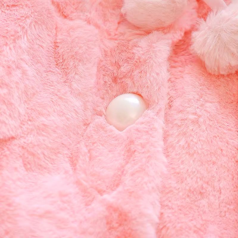 Questa adorabile giacca per bimba รจ realizzata in morbido peluche, perfetta per tenere la tua piccola al caldo durante le giornate fredde. Il cappuccio รจ decorato con simpatiche orecchie, aggiungendo un tocco giocoso e carino. La giacca presenta un fiocco al centro e due pompon pendenti, che la rendono ancora piรน affascinante. Le maniche ampie e il tessuto soffice garantiscono comfort e libertร di movimento. Ideale per passeggiate all’aperto o occasioni speciali, questa giacca รจ un must-have nel guardaroba di ogni bimba.