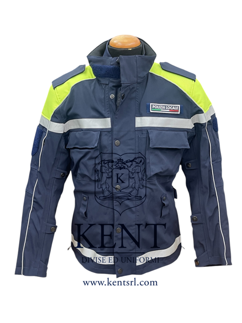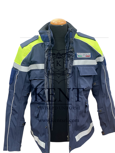 Giacca invernale DAINESEยฎ da motociclista in tessuto laminato PU elasticizzato impermeabile, traspirante, nastrato nelle cuciture, di colore blu, spalloni in tessuto di colore giallo con filamenti grigi rifrangenti. Completa di protezioni spalle, gomiti e schiena. Interno termico staccabile. Stampa transfer rifrangente โPolizia Localeโ sulla schiena ed etichetta โPolizia Localeโ sul davanti sinistro. DPI di II categoria, classe A.