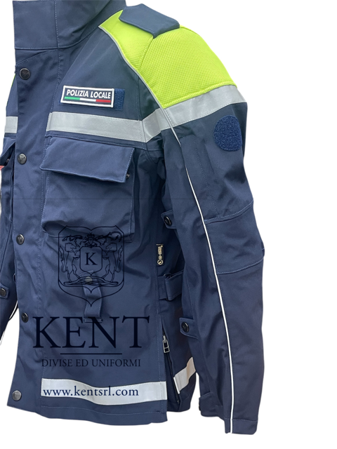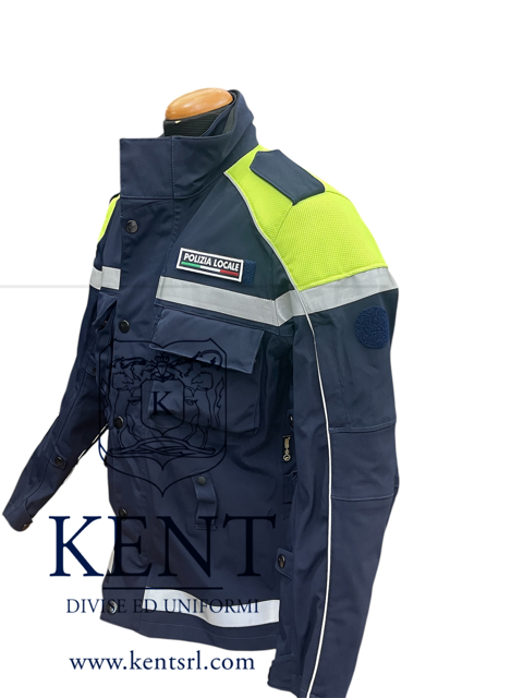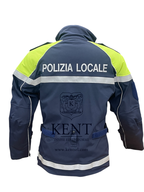 Stampa transfer rifrangente โPolizia Localeโ sulla schiena ed etichetta โPolizia Localeโ sul davanti sinistro.