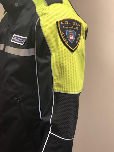 Giubbino estivo sfoderato realizzato in tessuto impermeabile traspirante Gore-Tex di colore blu, con inserti su fianchi, maniche e giromanica in tessuto impermeabile traspirante elasticizzato di colore blu, ed inserti su collo, spalle e maniche in tessuto di rinforzo colore giallo. Tessuto Gore-Tex 3 strati. Scritta fronte/retro Polizia Locale.