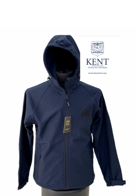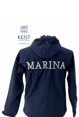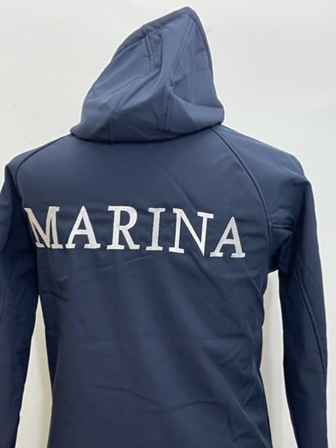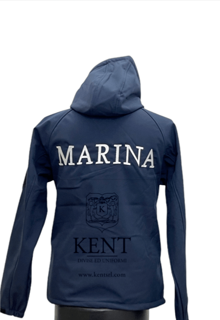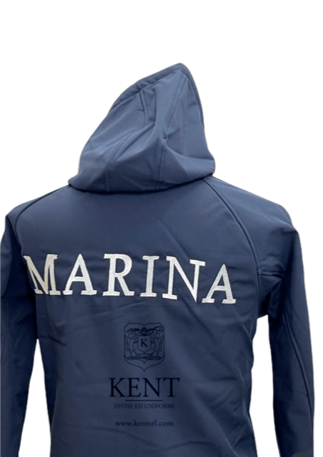 Giubbotto softshell con interno in pile, ricamo posteriore Marina. Cappuccio fisso. Velcro lato cuore per applicazione grado.