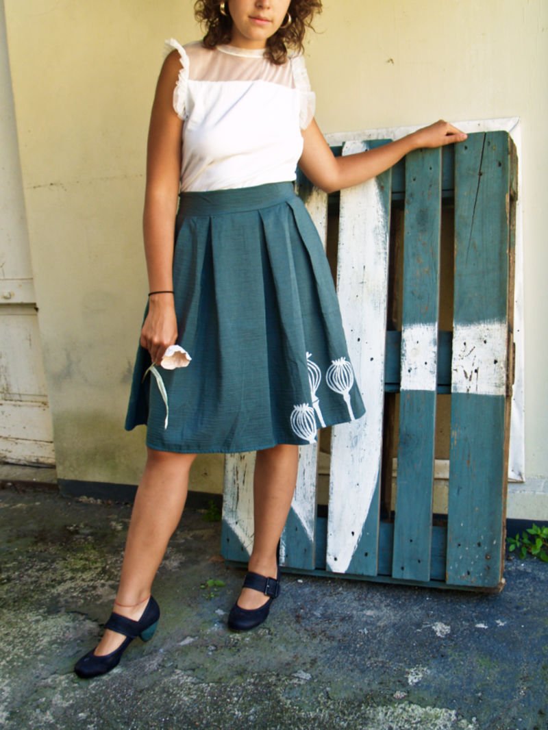 Gonna Esmeralda in tessuto di 100% Crêpe di Seta, color Petrolio chiaro, con stampa. Artigianale con tecnica di linoleografia La gonna Esmeralda è caratterizzata dalla presenza di ampie pieghe sul davanti, che le conferiscono un aspetto classico delle gonne anni 50. Con tasca nascosta sul lato, sul retro, è arricciata, dotata di un comodo elastico che rende la vestibilità estremamente versatile, adattandosi perfettamente a taglie che vanno dalla 42 alla 46. Realizzata interamente in cotone, questa gonna offre un comfort eccezionale e una leggerezza ideale per l’estate. La sua fattura artigianale garantisce inoltre un’attenzione ai dettagli che rendono ogni pezzo…