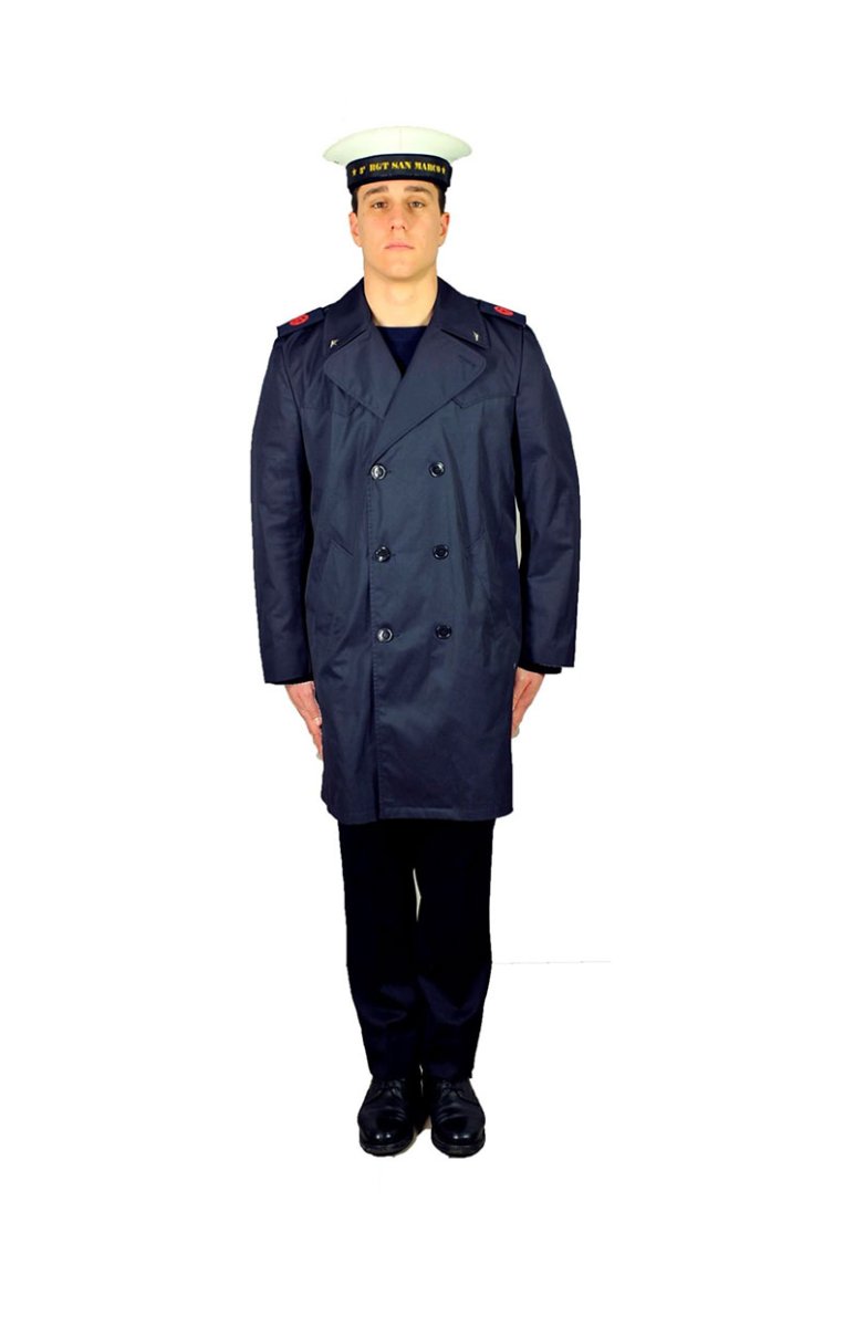 Impermeabile Marina Militare, doppio petto, con spalline per inserimento tubolari. Interno foderato con trapunta staccabile agganciata con bottoni. In uso ai militari di truppa VFI