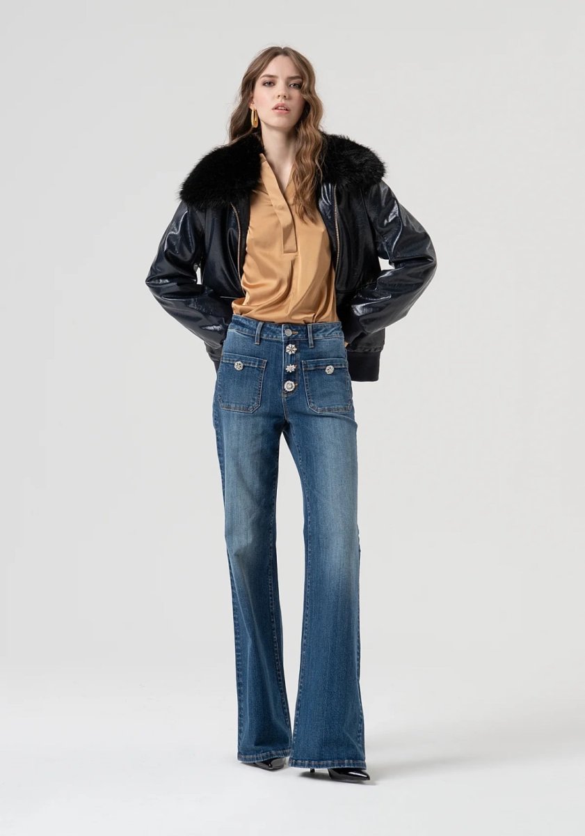 Rinnova il tuo guardaroba con questi jeans a zampa in denim dal lavaggio medio, perfetti per un look elegante e contemporaneo. Realizzati in tessuto di alta qualità con 98% cotone e 2% spandex, offrono comfort e una vestibilità che valorizza la silhouette. Il modello presenta una vita regolare, arricchita da raffinati bottoni gioiello applicati che aggiungono un tocco chic e distintivo. Le tasche applicate sul davanti donano praticità e un dettaglio retrò, mentre l’ampio fondo gamba a zampa slancia la figura ed esalta lo stile anni ’70, reinterpretato in chiave moderna. Vestibilità: Flare Stile: Chic e femminile Stagione: Autunno/Inverno 2025…