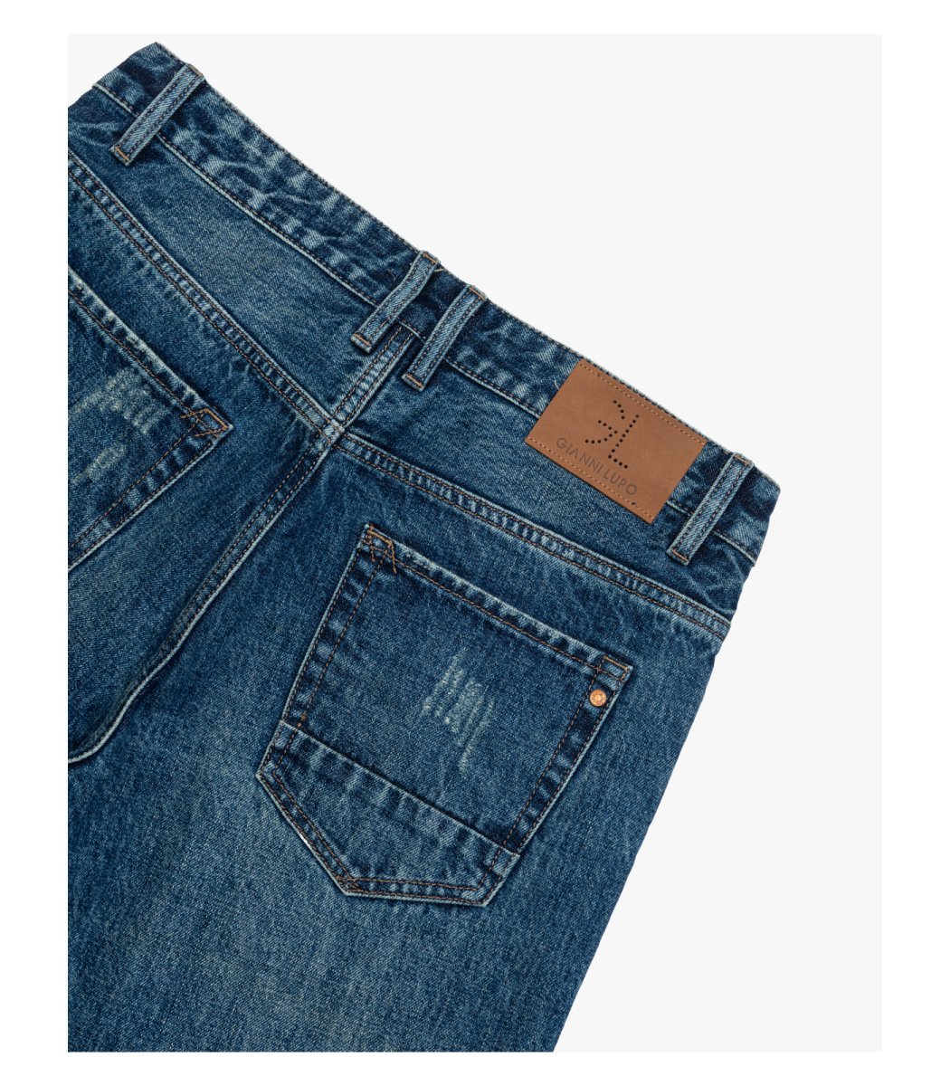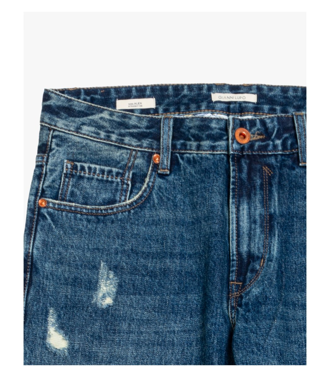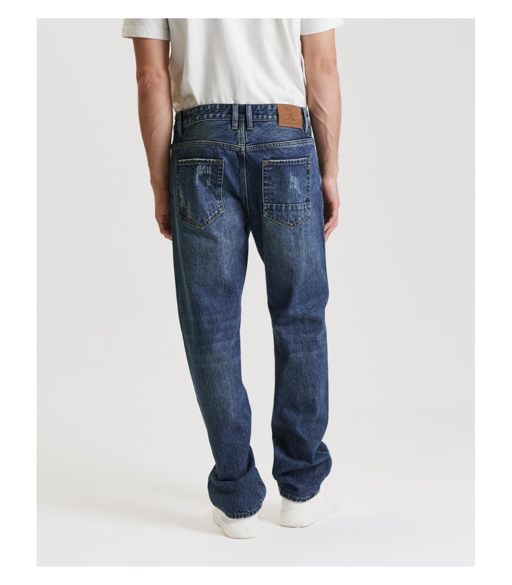 Jeans uomo dal taglio straight fit, realizzati in denim 100% cotone. Il lavaggio medium vintage con dettagli consumati e strappi dona un look autentico e grintoso. Completano il modello i rivetti e bottone a contrasto, chiusura con zip e classico design a 5 tasche. Un capo versatile e di tendenza, perfetto per outfit casual e streetwear. Composizione: 100% Cotone Vestibilitร : Straight fit Colore: Medium wash con strappi