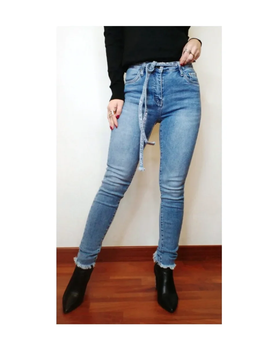 Jeans basic skinny, lavaggio medio chiaro, elasticizzato e regular, 5 tasche, bottone e zip, dotato di passanti e cinturina strass, sfrangiato sulla caviglia!