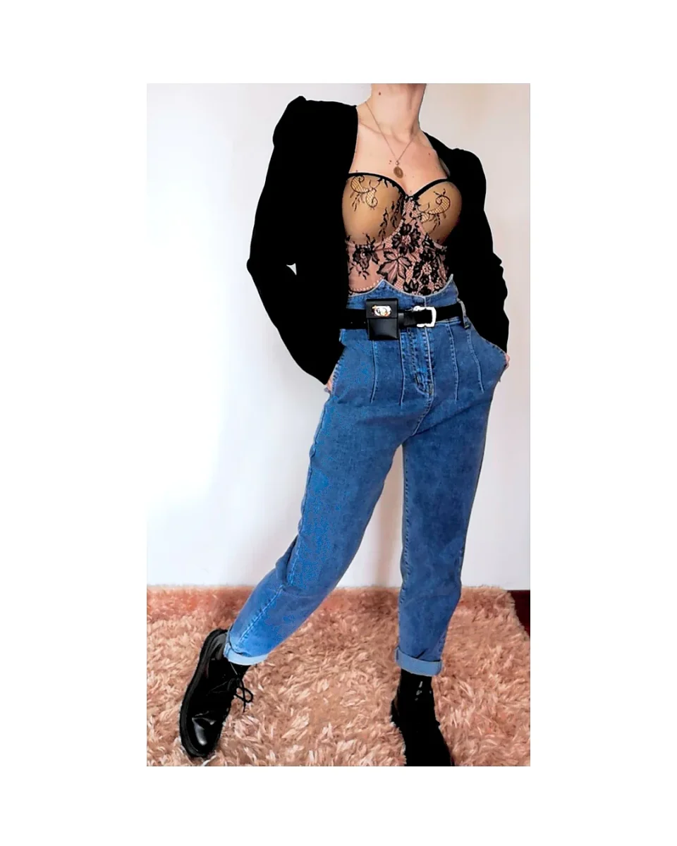 Jeans a vita alta con corpetto a V, lavaggio scuro, comodo nella vestibilitร sui fianchi, dritto sulla caviglia, due tasche laterali, due bottoni e zip, dotato di cintura borsellino!