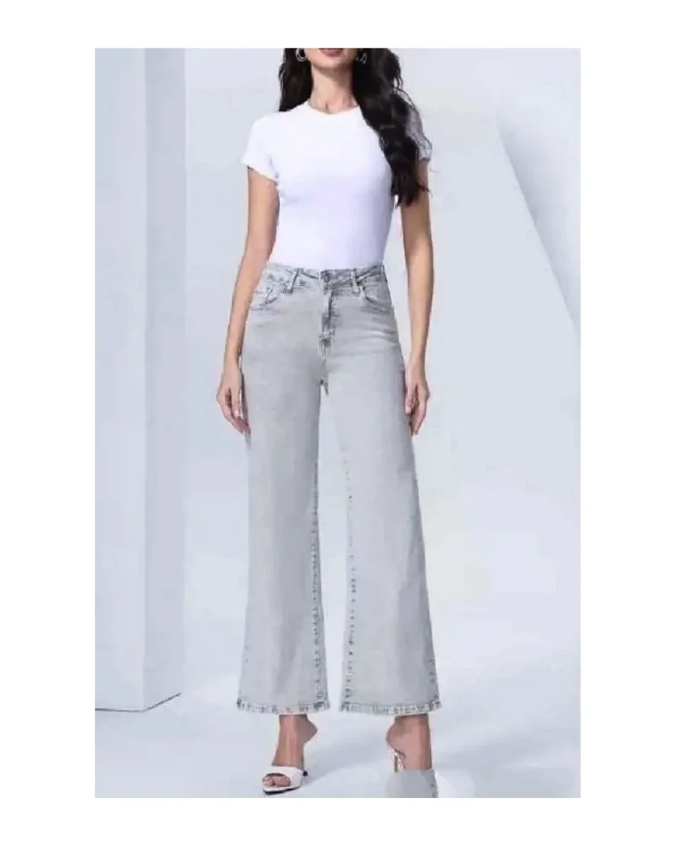 Jeans sempre di tendenza, Wide Leg : vita medio-alta con ampiezza regolare dal fianco fino alla gamba, casual e street, per chi cerca la comoditร senza rinunciare al suo stile. Tono di grigio con lavaggio chiaro 5 tasche, bottone e zip, elasticizzato.
