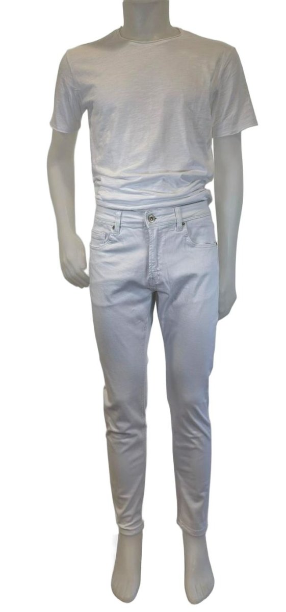 Jeans uomo di Gianni Lupo, modello Bruce, in colore bianco. Realizzati in una confortevole composizione di 98% cotone e 2% elastan, offrono una vestibilitร slim moderna e aderente. Ideali per un look fresco e versatile, si adattano perfettamente a ogni occasione casual. Chiusura con bottone e zip, cinque tasche.