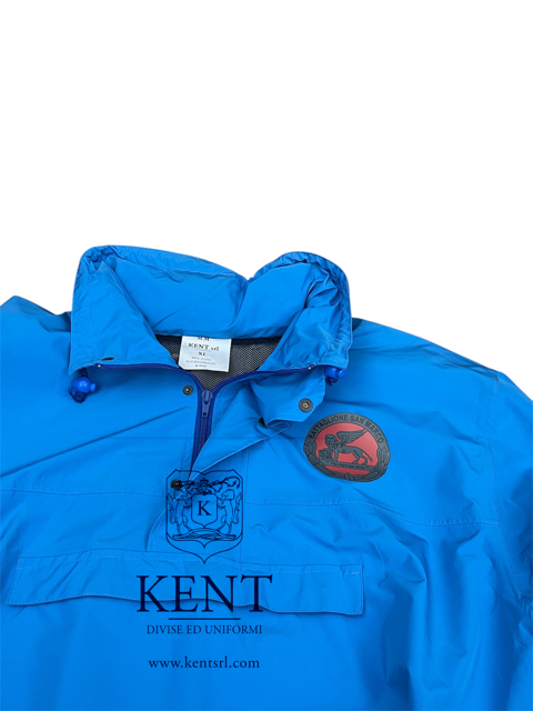 K-Way realizzato in tessuto PTFE impermeabile e traspirante, con logo lato cuore Battaglione San Marco. Collo con 1/2 zip, cappuccio interno al collo. Tasca anteriore chiusa con cerniera e pattina. Fondo regolabile con coulisse.