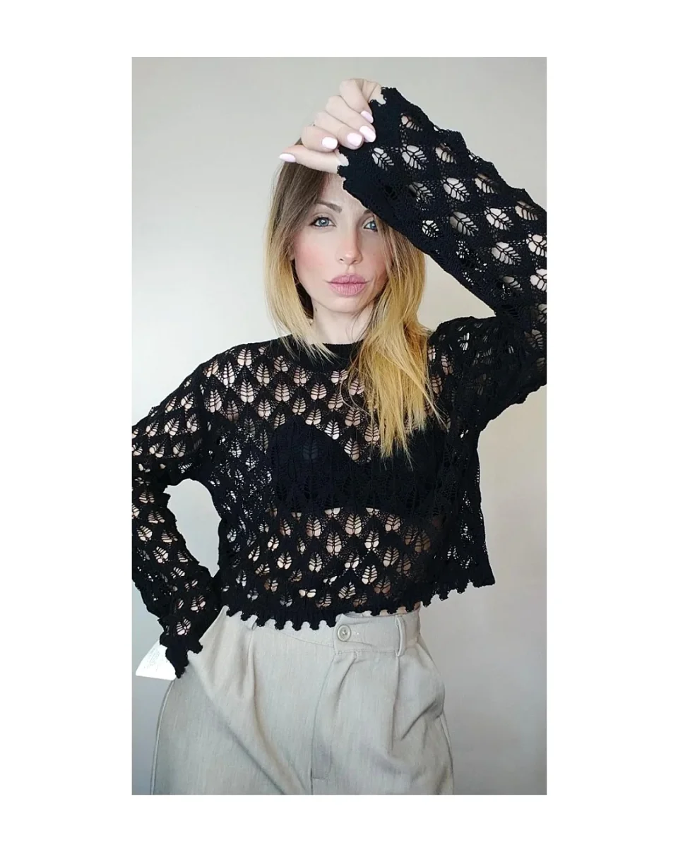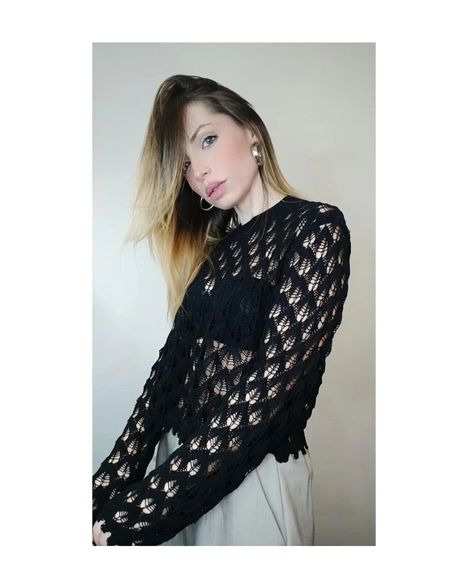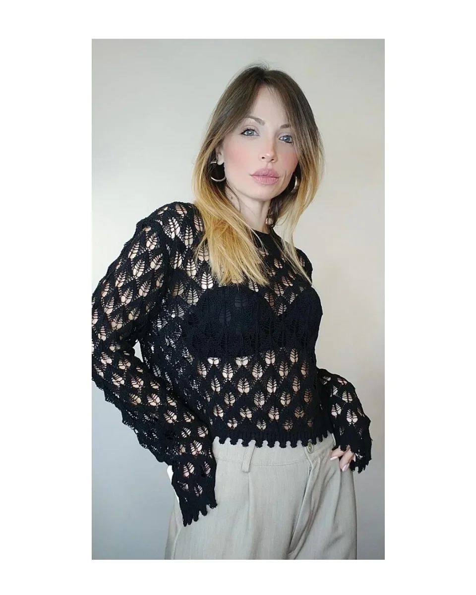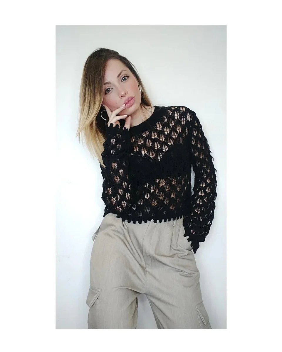 Maglioncino trendy e femminile complemente traforato, consistente e di alta qualità in 100% viscosa, girocollo e manica lunga, tinta unita in nero.