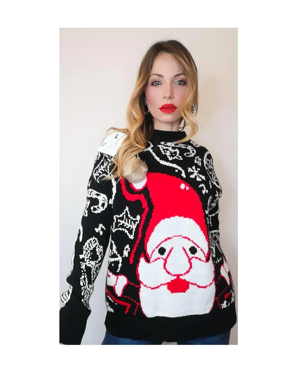 ..Maglione regular di lunghezza e vestibilitร in acrilico consistente, girocollo, la particolaritร del Pon Pon con la faccia di Babbo Natale sul davanti viene ripresa dal cappello sul retro con stampa natalizia sui fianchi! ๐๐๐