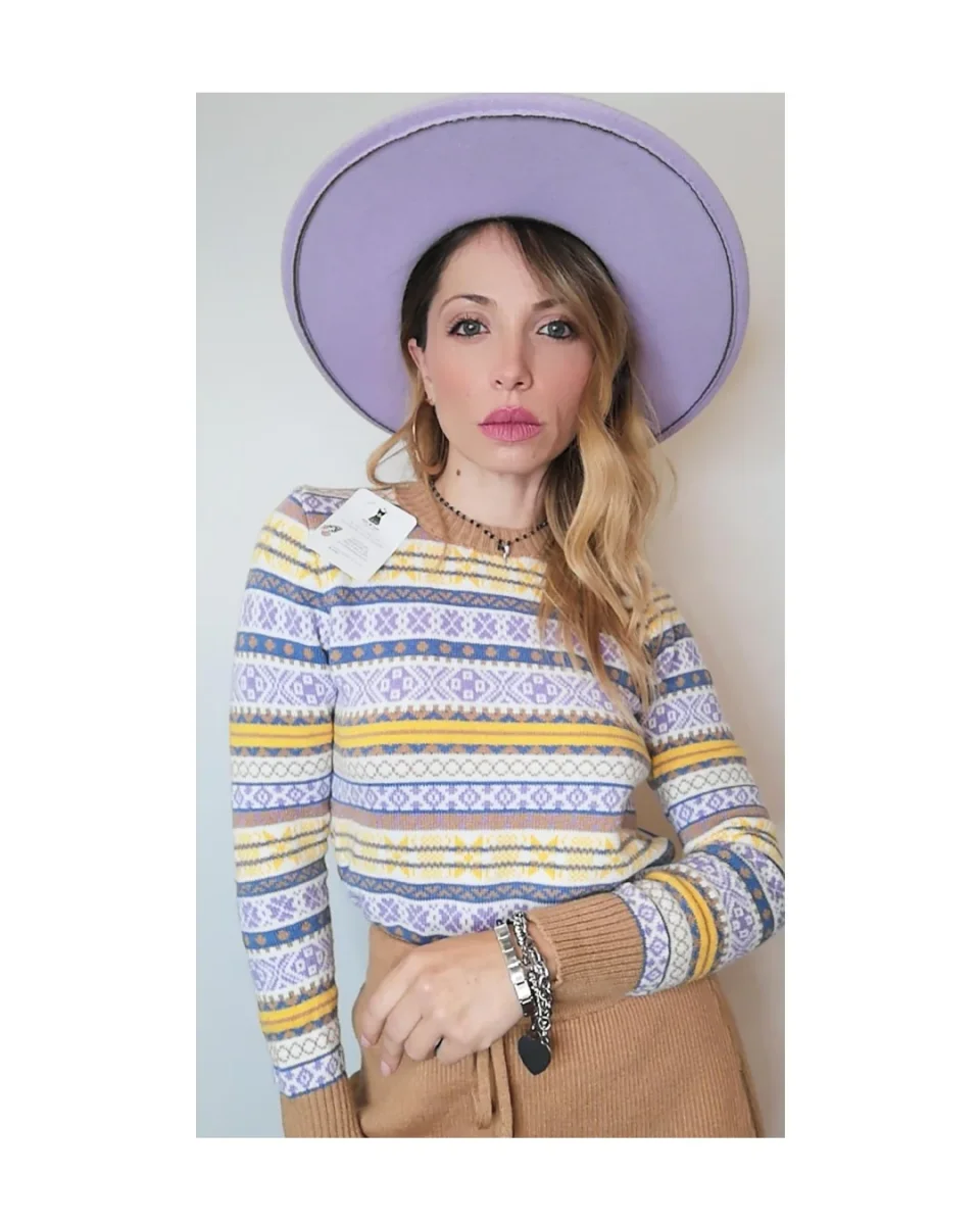 Maglione stile montagna con disegni e palette colori che esalta il girocollo e giromanica in tinta unita, morbido, caldo ed avvolgente in misto viscosa, lunghezza più cortina di un regular!
