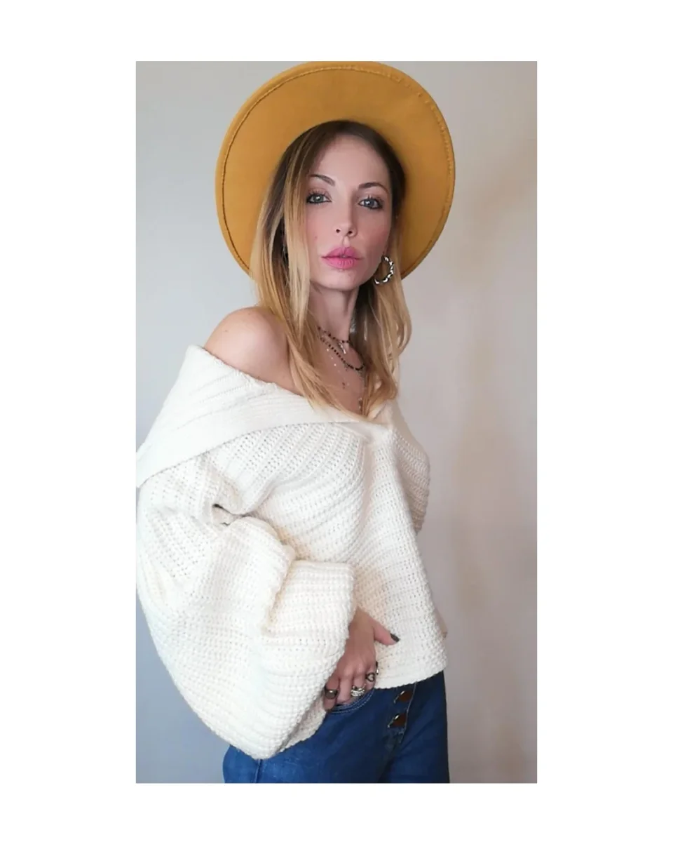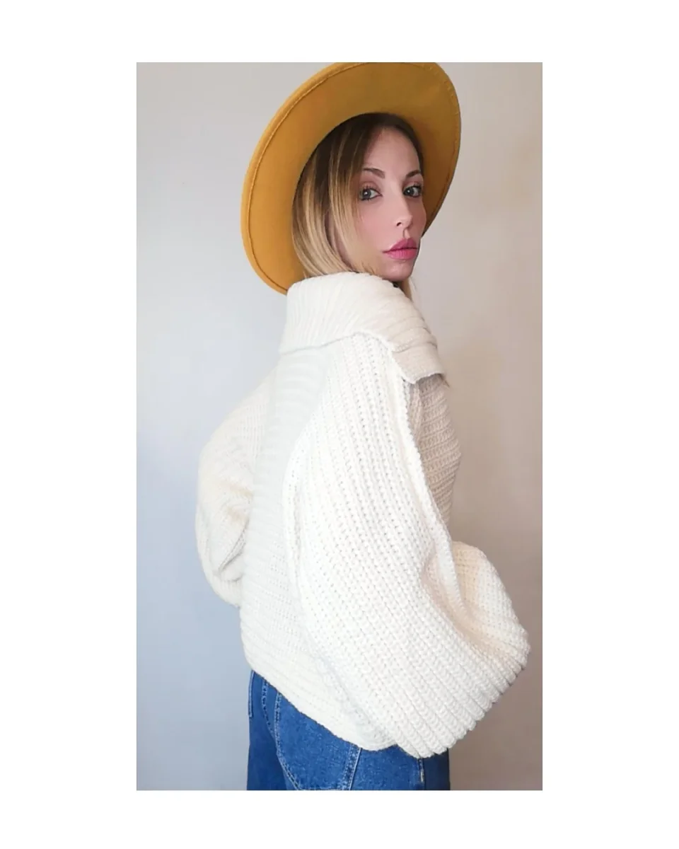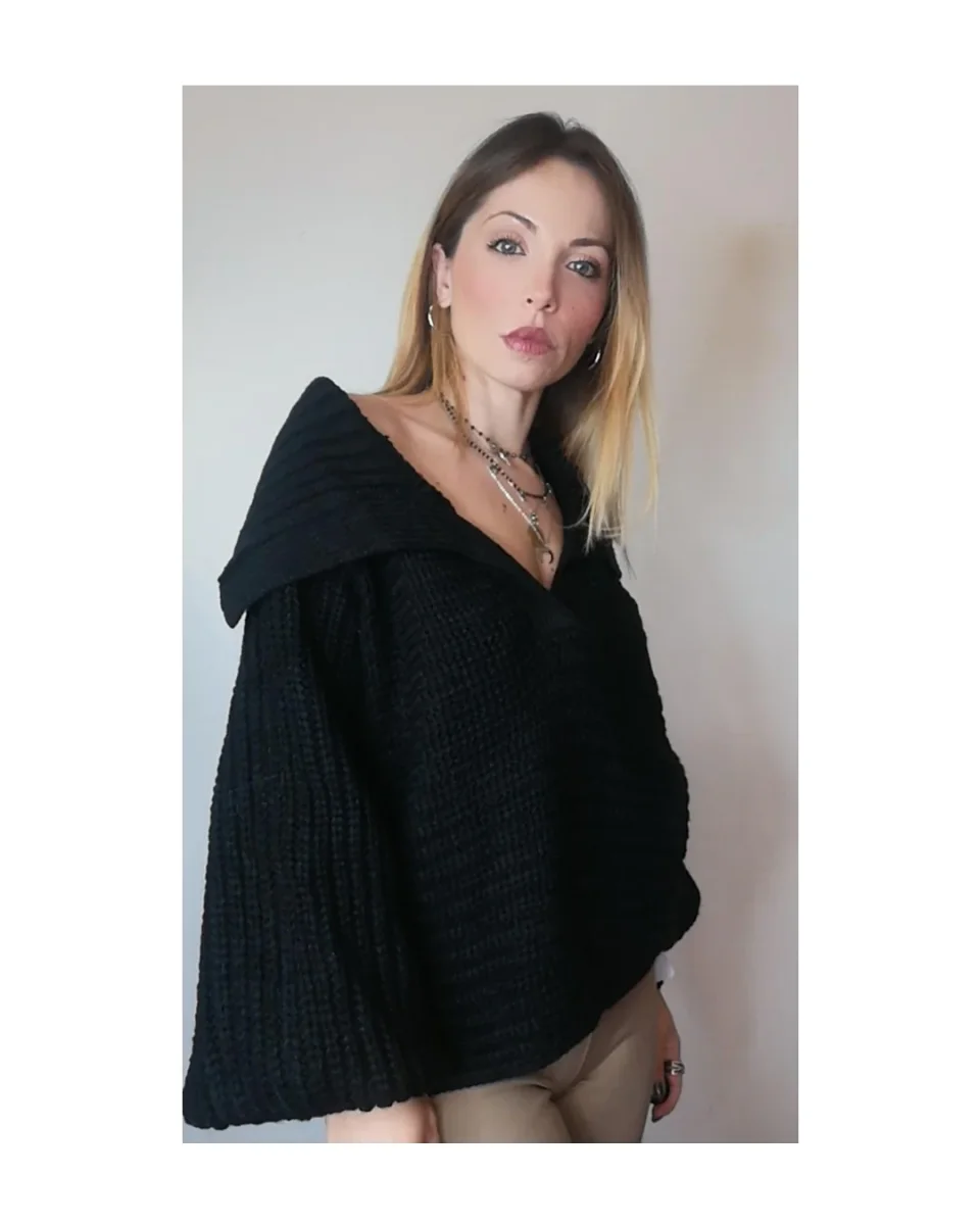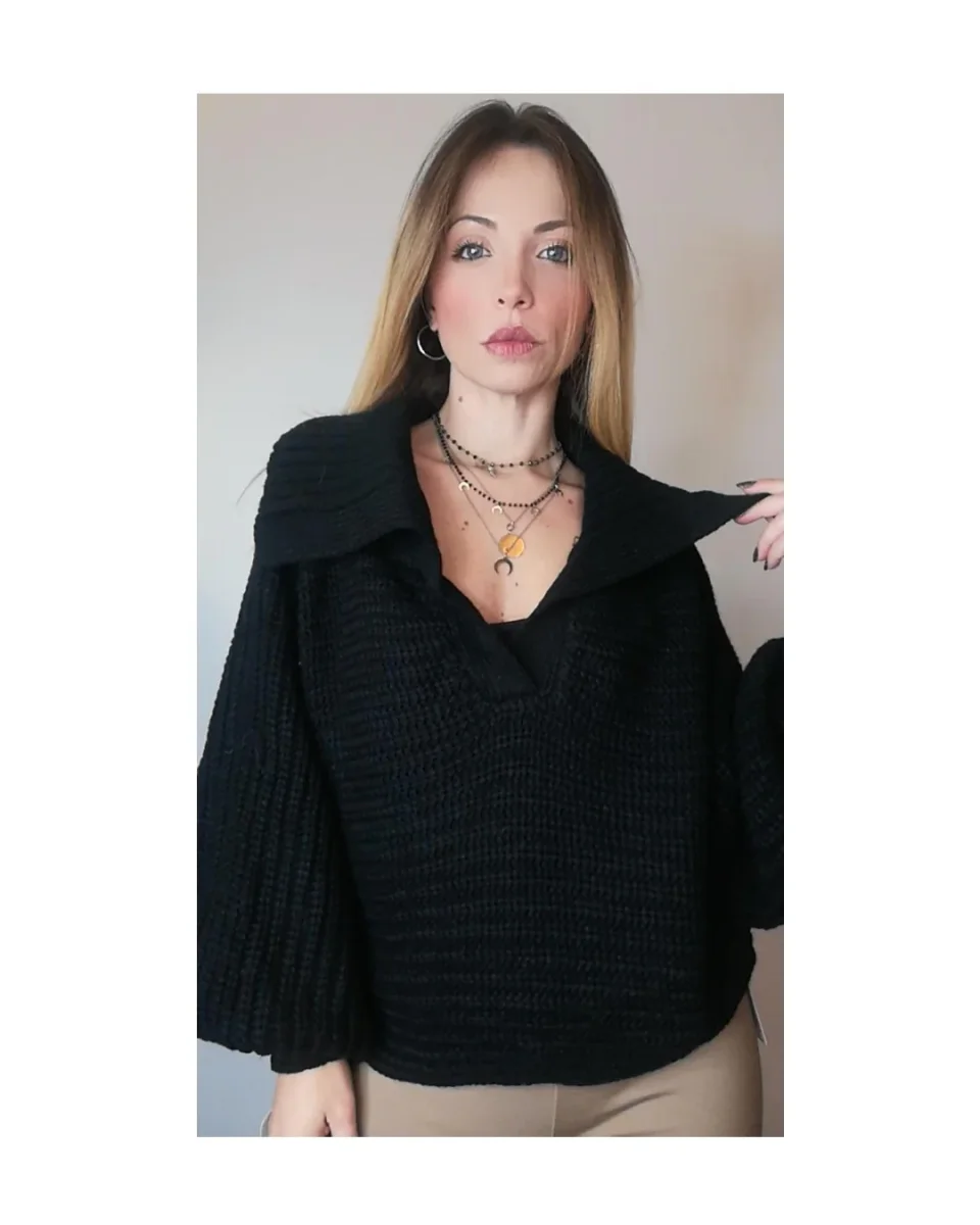 Maglione con classico colletto a ‘Polo’, da poter essere indossato anche con spalla scoperta, consistente, caldo e poderoso, taglio dritto, ampio e cortino con manica leggermente baloon, tramato a nido d’api in tinta unita!
