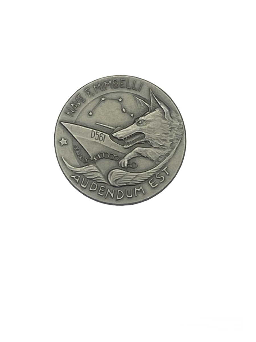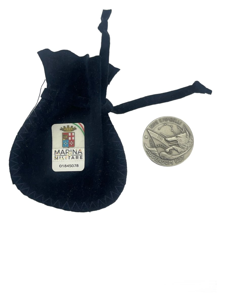 Medaglia cm. 2,5 in metallo argentato satinato con fondo brunito, con diritto personalizzato con logo Nave Mimbelli. Rovescio liscio. Confezionata in sacchetto fioccato blu.