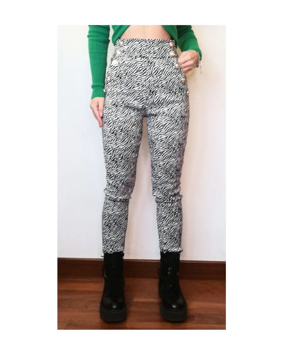 Pantalone vita alta, stretch elasticizzato a sigaretta con la particolaritร dei bottoni cuciti, zip laterale, fantasia zebrata!