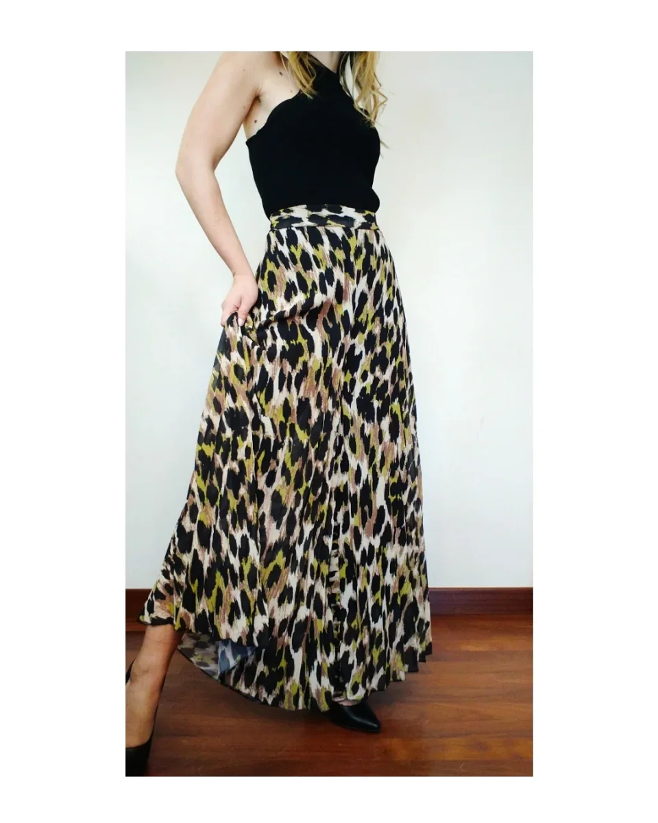 È bella come una gonna ma, la comodità è di un pantalone anzi di un panta-farfalla, consistente, fluttuante, plissettato, elastico in vita, doppio strato con sottana in viscosa, stampa animalier con toni nero/crema/lime.