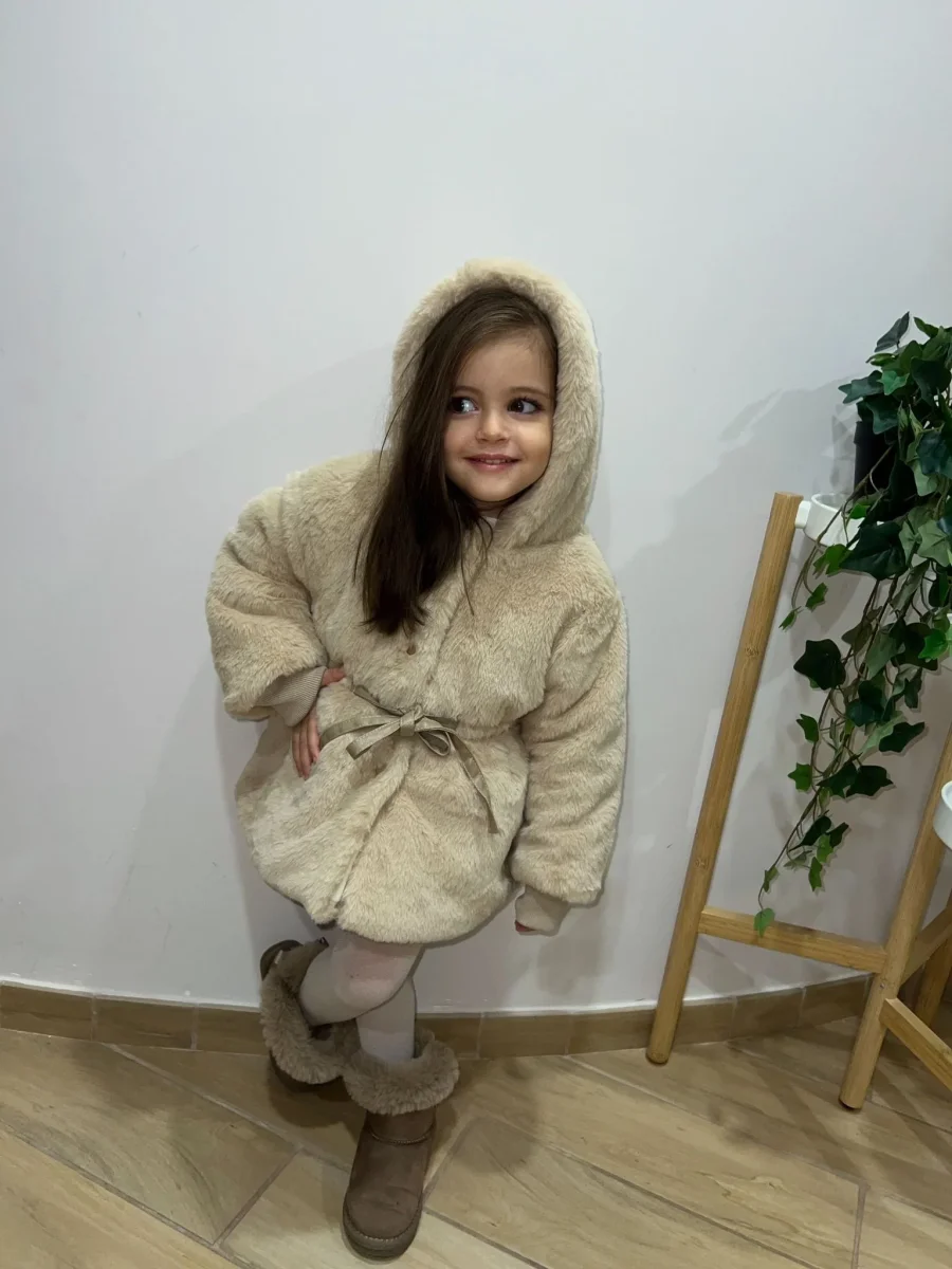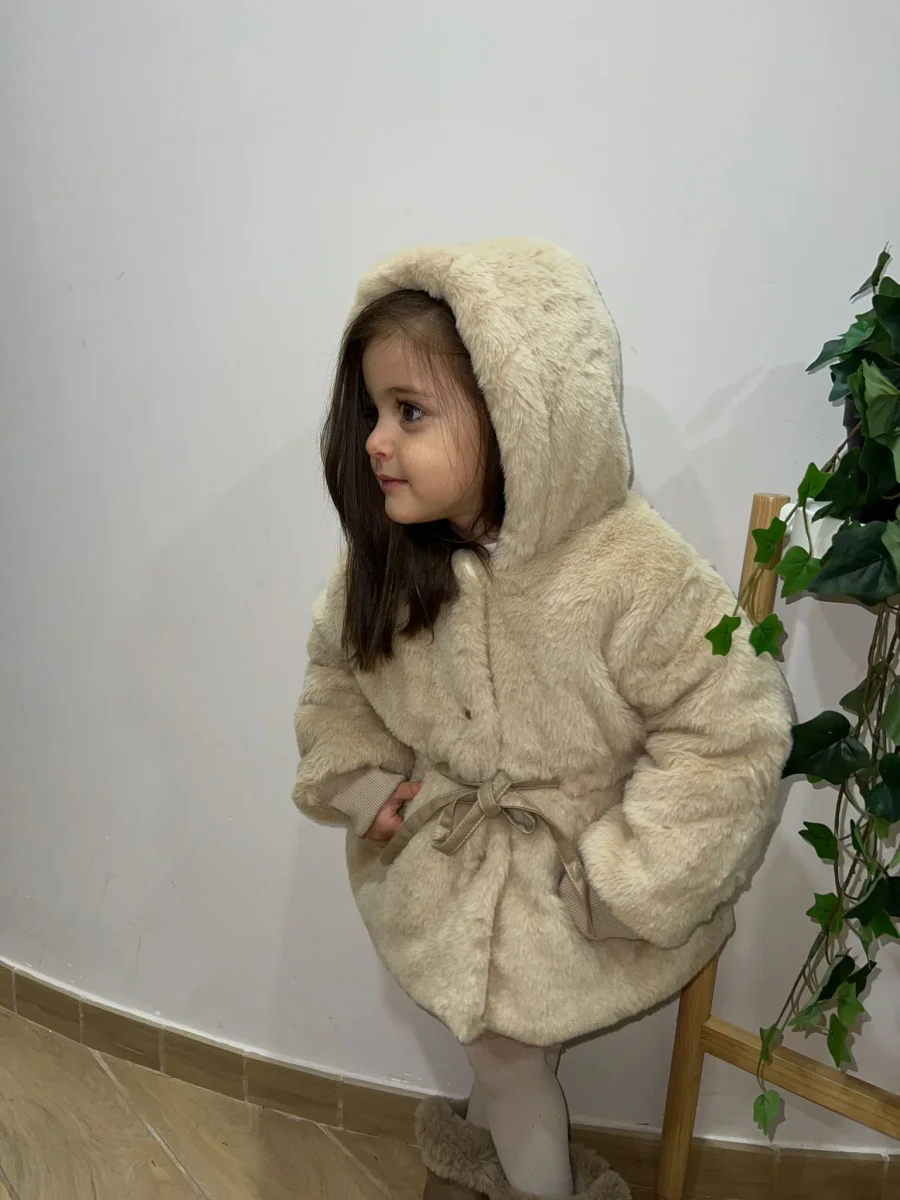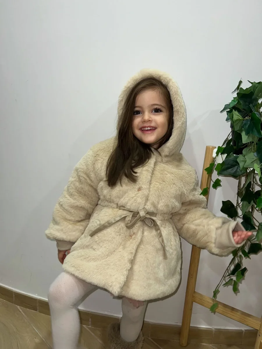 Questa adorabile pelliccia per bambine รจ disponibile in vari colori. Realizzata con materiali di alta qualitร , offre calore e comfort durante i mesi piรน freddi. La pelliccia presenta un design elegante con un cappuccio foderato. Un fiocco decorativo sul davanti aggiunge un tocco di dolcezza. L’interno รจ foderato con un materiale morbido e confortevole, perfetto per mantenere la tua bambina al caldo. Questa pelliccia รจ ideale per ogni occasione, dalle passeggiate invernali alle uscite speciali.