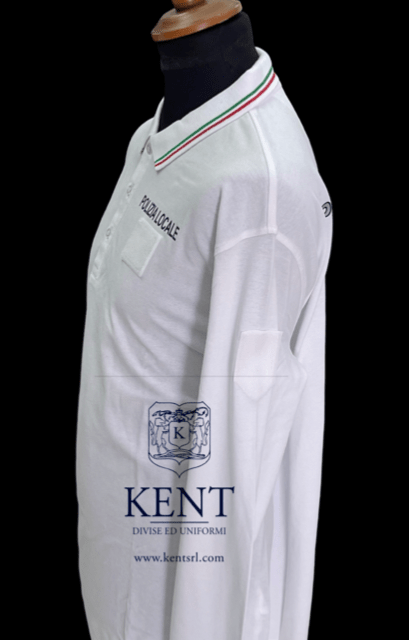 Polo in 100% cotone, manica lunga, collo e polsi con bordino tricolore. Ricamo fronte/retro Polizia Locale, velcro al petto e al braccio.