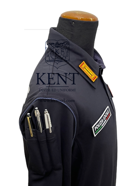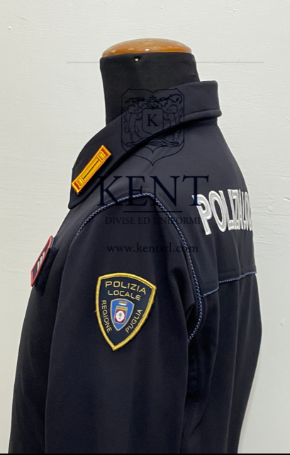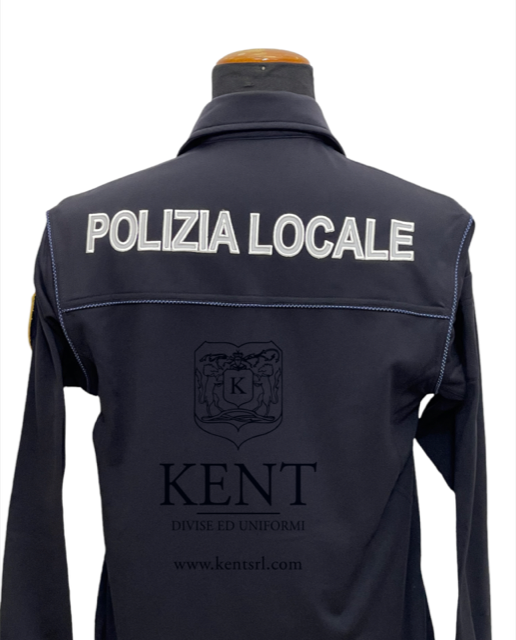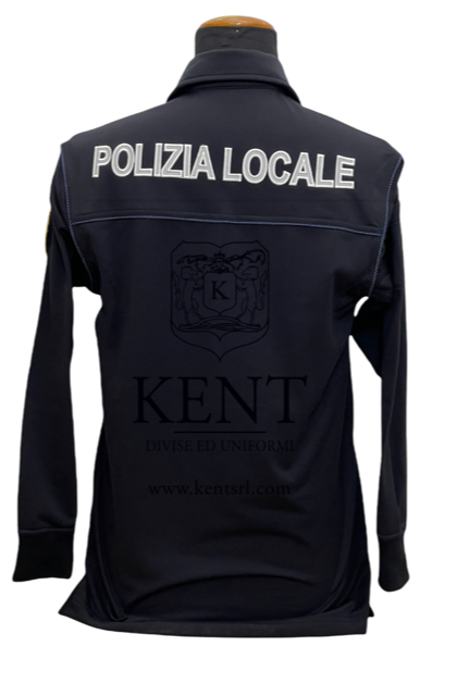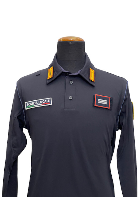 Polo blu manica lunga, in tessuto tecnico. Profilo rifrangente sul giro manica e sulla spalla. Ricamo posteriore rifrangente. Velcro al collo, velcro a forma di scudetto al braccio, velcro lato cuore per applicazione grado. Targhetta Polizia Locale.