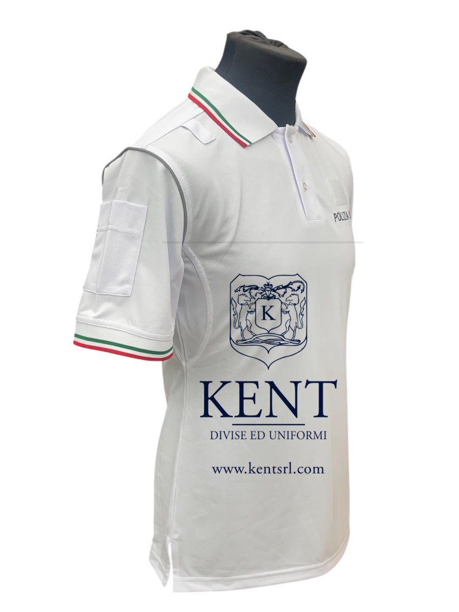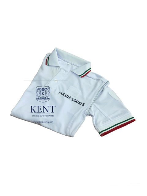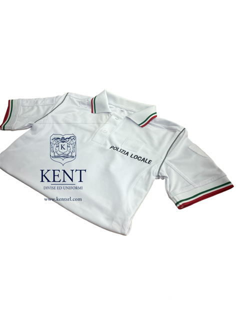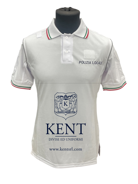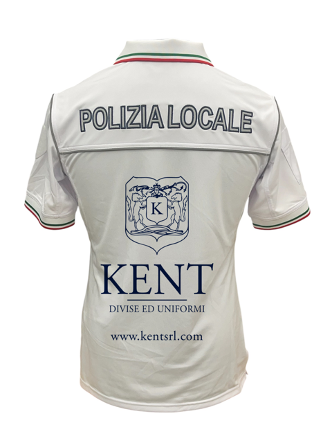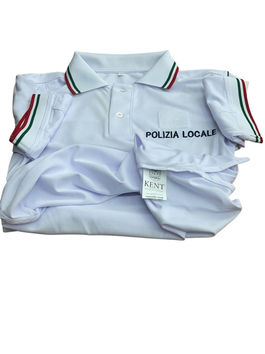 Maglietta polo con colletto, polsini e doppio fessino in costina 2×1. Apertura anteriore verticale con pistagna e contropistagna. Sulla pistagna รจ realizzata un’asola e in corrispondenza sono cuciti due bottoni a quattro fori sulla copripistagna. Maniche corte a giro con polsino con bordino tricolore. Parte sottoascellare in tessuto indemagliabile. Tagli anteriori con codina di topo rifrangente. Doppio taschino portapenne con quattro scomparti sulla manica dx. Asola in gros grain con luce 3 cm. Porta fischietto sulla spalla dx. Nastro asola scudetto Italia sulla manica sx. Il fondo presenta un risvoltino interno alto circa 3 cm. Spacchetti laterali. Carrรจ posteriore. Ricamo anteriore scritta Polizia Locale di colore blu. Ricamo posteriore sul carrรจ, scritta Polizia Locale in materiale retroriflettente bordato di blu.