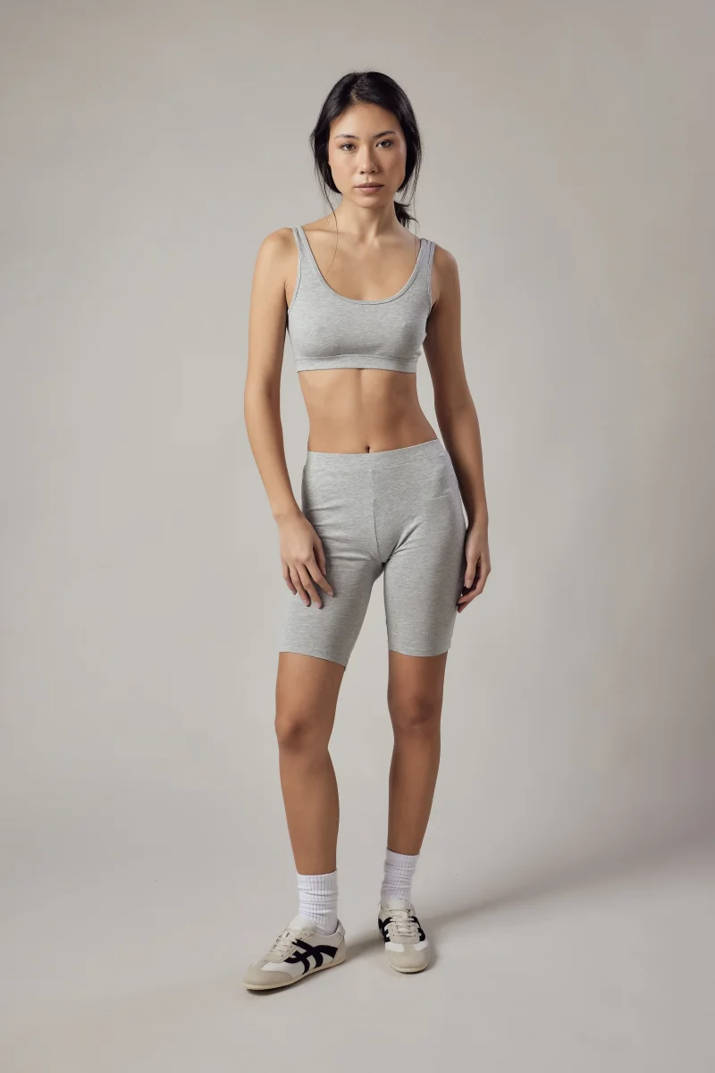Set composto da biker e top sportivo. Realizzato in cotone organico certificato di alta qualitร e elastane.La variante Grigio Chiaro Melange include una percentuale di viscosa nella composizione.