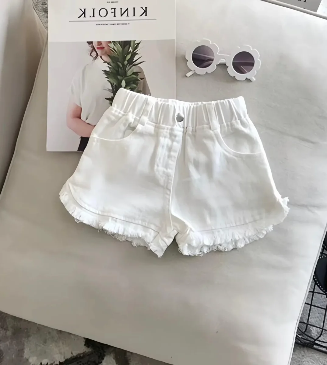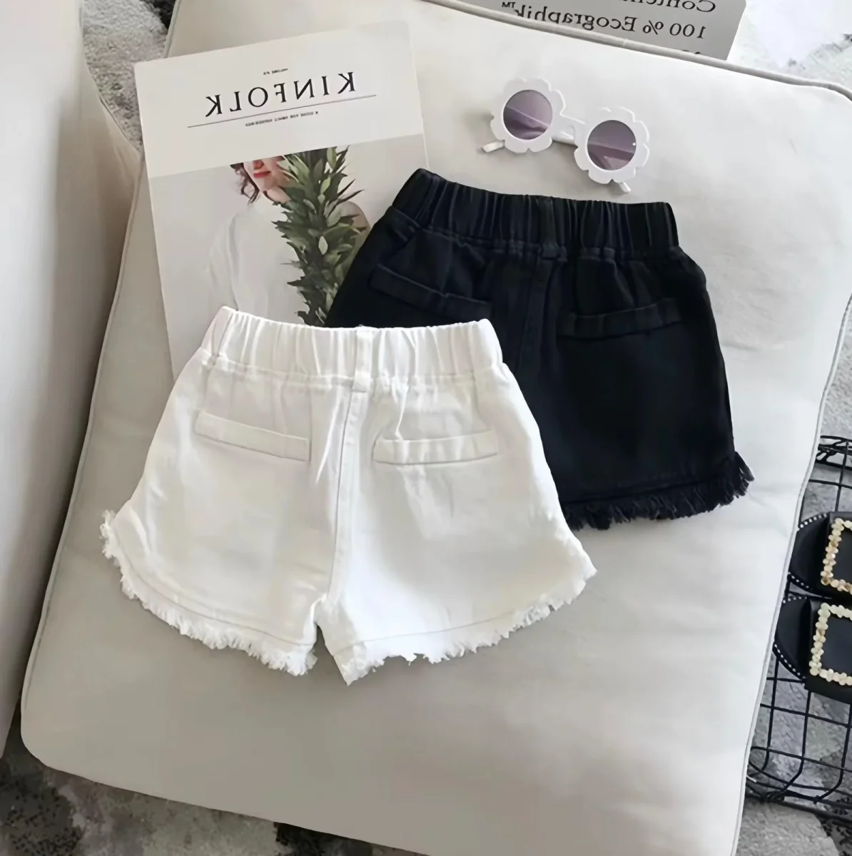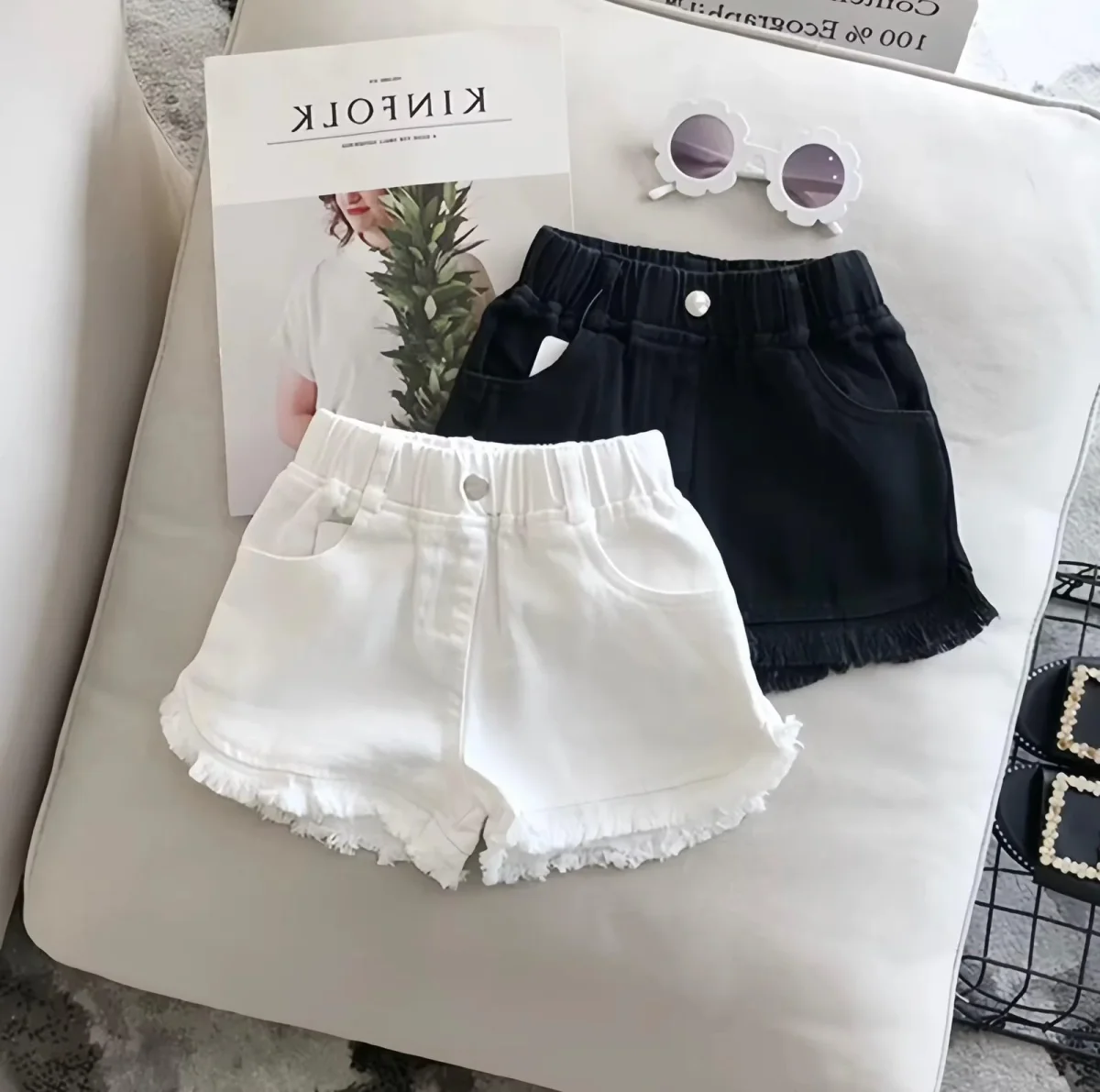 Pratici, versatili e super alla moda! Questi shorts da bambina in denim leggero sono perfetti per ogni avventura estiva. Disponibili in bianco e nero, con dettaglio sfrangiato sul fondo e vita elasticizzata per il massimo comfort. Ideali da abbinare con t-shirt o top per un look casual e stiloso.