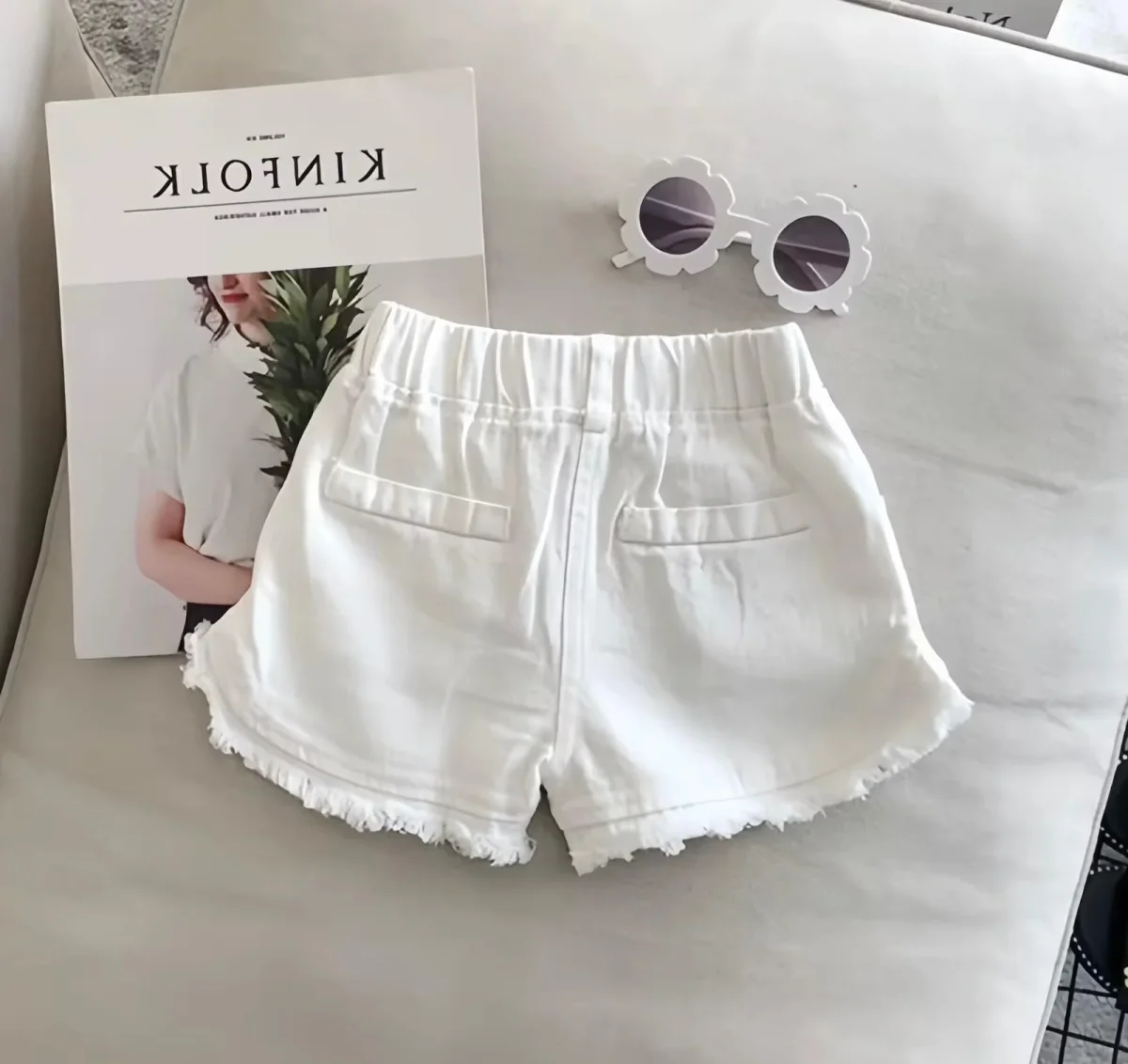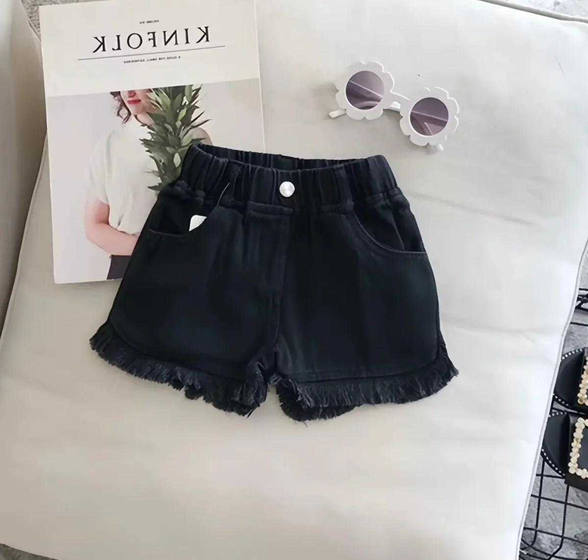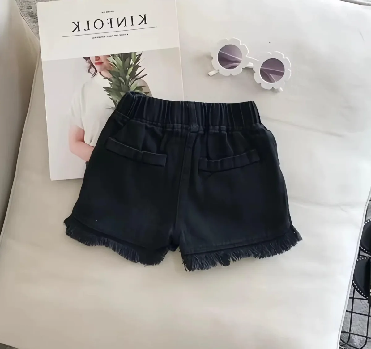Pratici, versatili e super alla moda! Questi shorts da bambina in denim leggero sono perfetti per ogni avventura estiva. Disponibili in bianco e nero, con dettaglio sfrangiato sul fondo e vita elasticizzata per il massimo comfort. Ideali da abbinare con t-shirt o top per un look casual e stiloso.